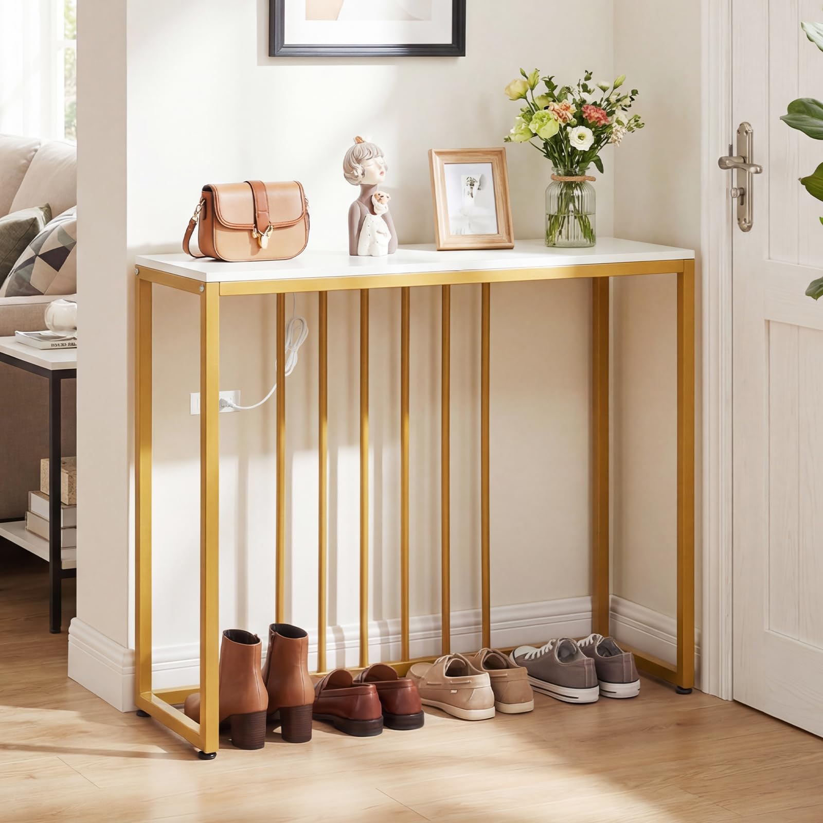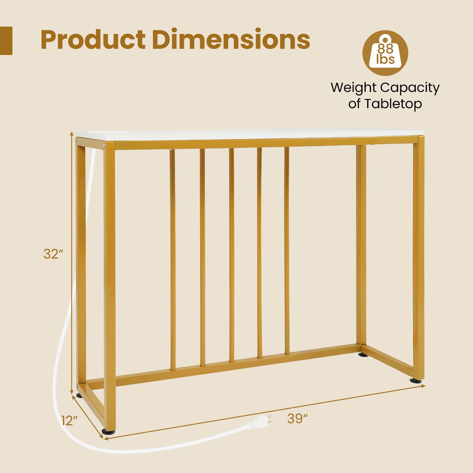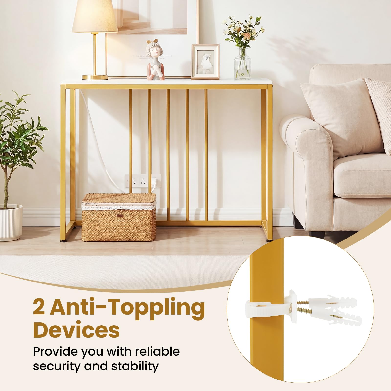 This narrow sofa table combines stylish minimalist design with practical functionality, featuring a sleek 39" spacious tabletop perfect for displaying decorative items while keeping your space organized. Plus, built for stability and durability, the side table behind sofa boasts a robust metal frame, adjustable foot pads and anti-toppling devices to ensure steady support in busy homes. Designed with versatility in mind, this accent table fits seamlessly in entryways, hallways or behind sofas, enhancing your interior with elegance. Meanwhile, the integrated charging station, designed with 2 AC outlets, 1 USB and 1 Type-C port, provides convenient power options for phones, tablets and other devices right from the tabletop, making it ideal for modern family living.