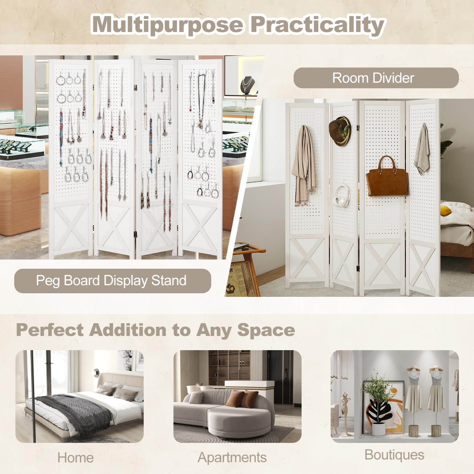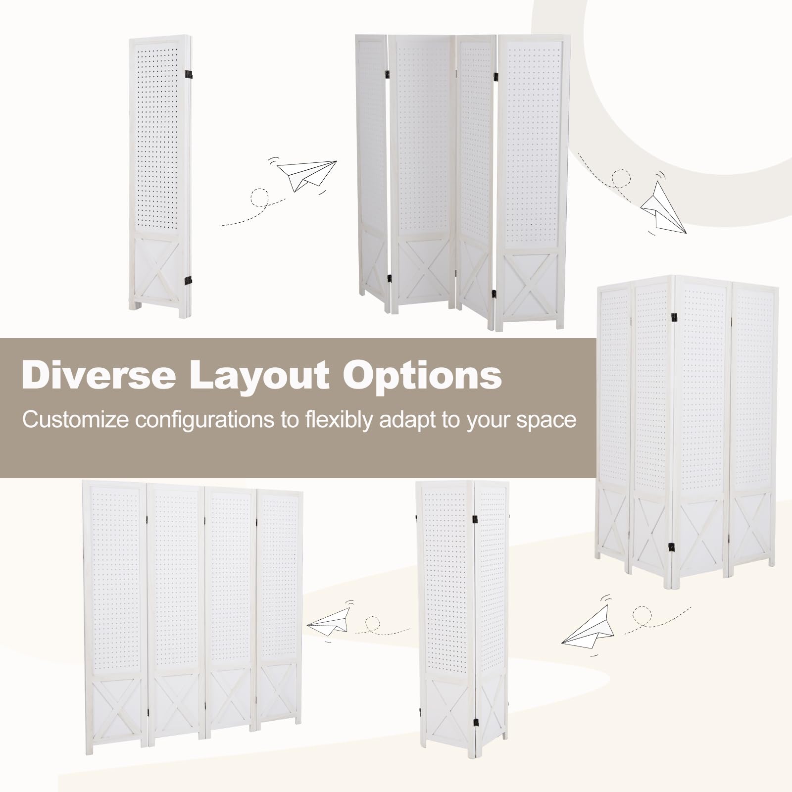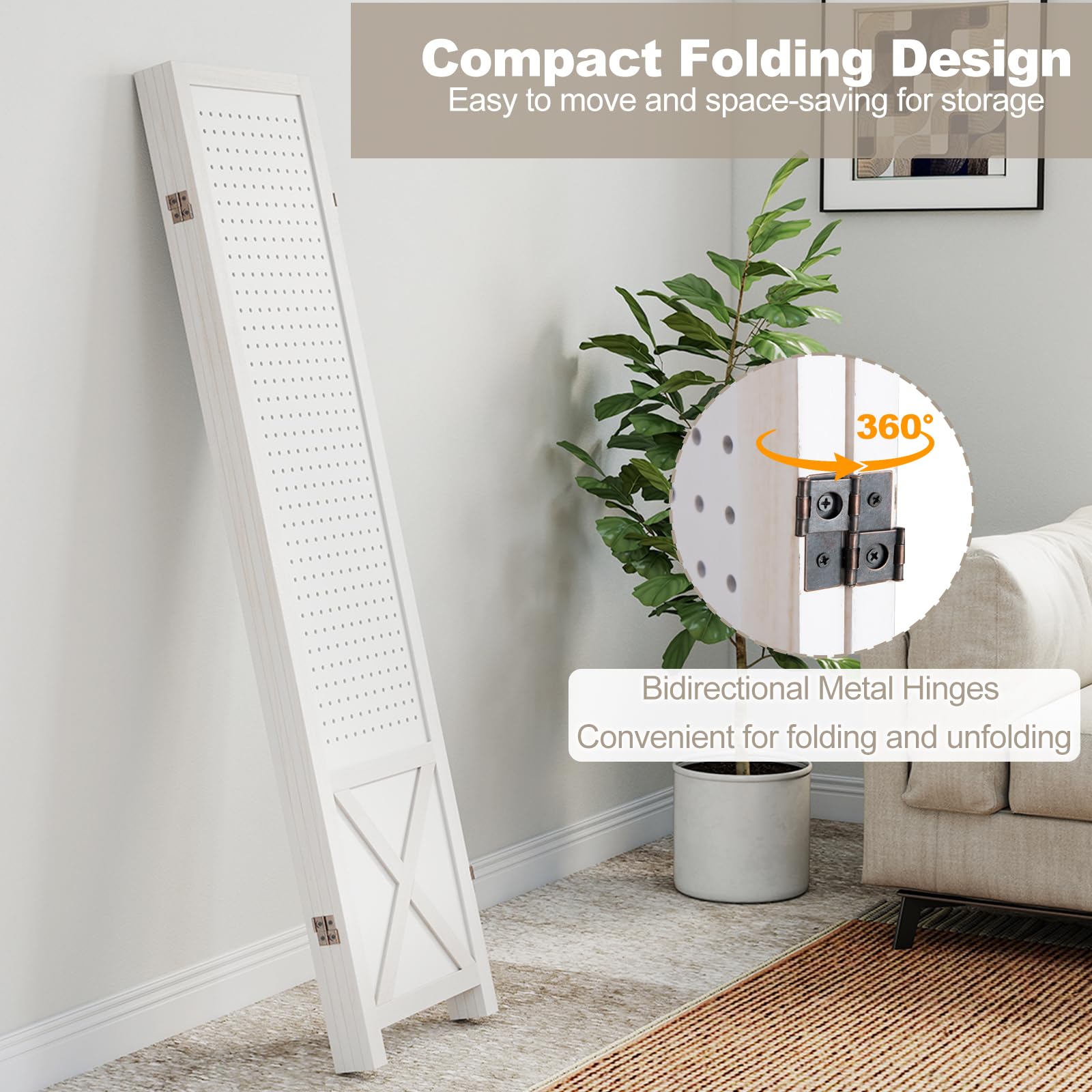 Refresh your space with this versatile room divider featuring a functional pegboard display. Compatible with various hooks, it offers customizable storage for tools, crafts, and jewelry. The folding design allows flexible positioning and easy storage, while the solid wood frame ensures durability and long-lasting performance. Perfect for homes, workshops, retail spaces, and trade events. Ready to use right out of the box—no assembly required.