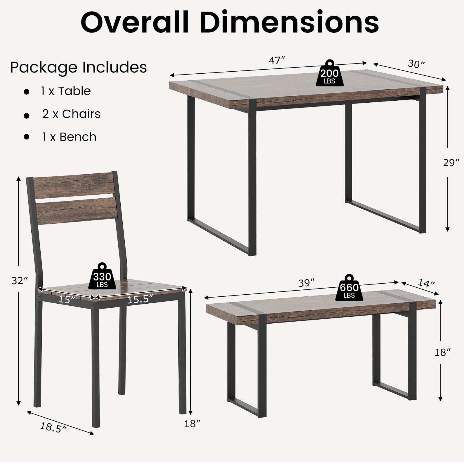 Includes a table, a bench, and 2 chairs, ideal for family and friend gatherings