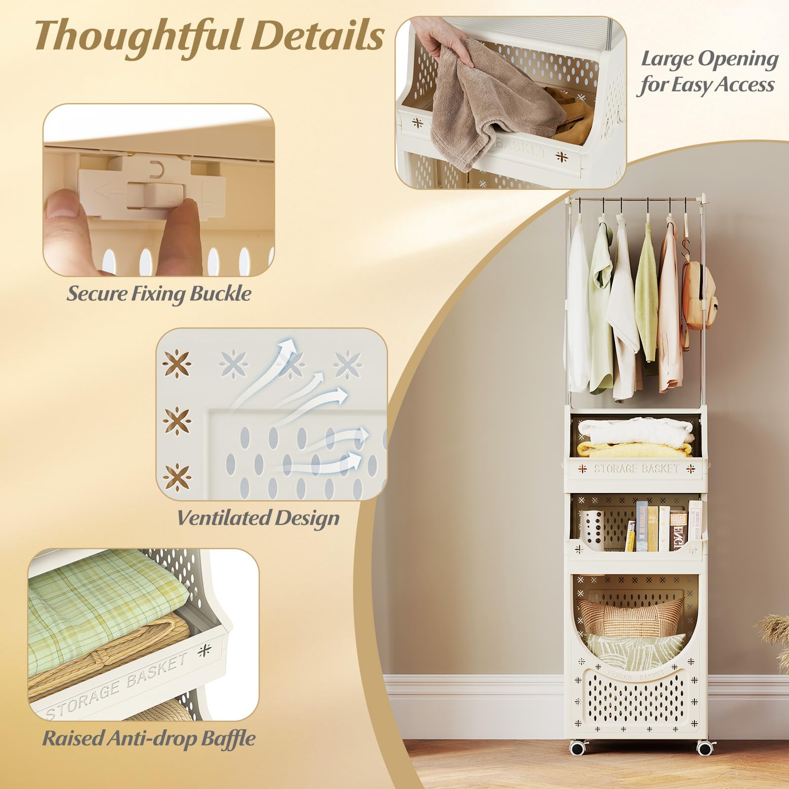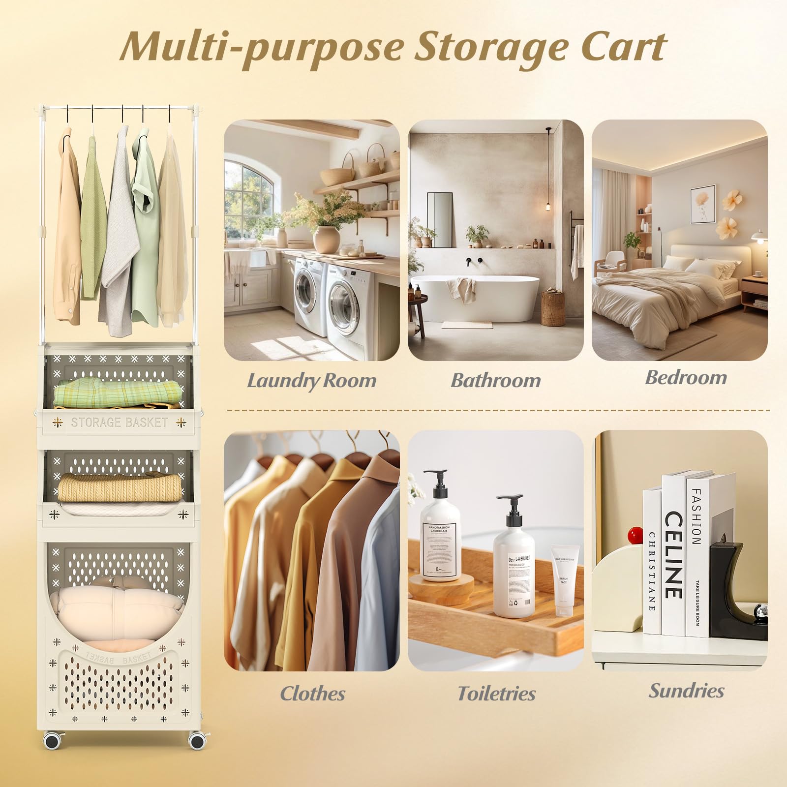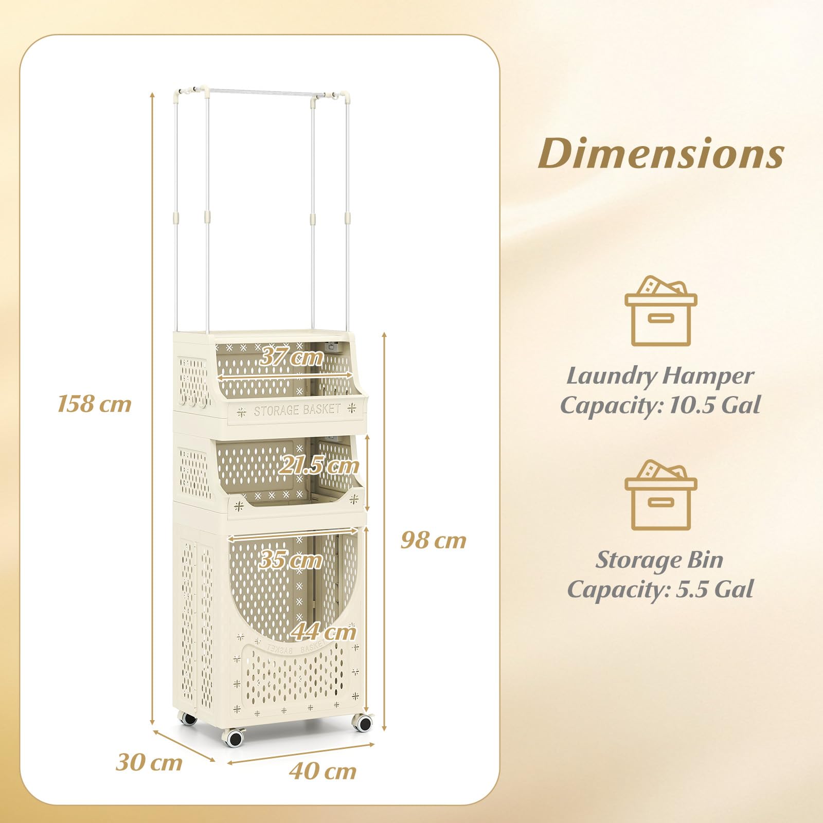 This 2-in-1 laundry cart combines a hanging bar for air-drying clothes, a spacious hamper and 2 baskets for garments, socks or blankets, along with a top shelf for detergents. Plus, 8 extra hooks holds towels or brushes with ease. The tool-free assembly lets you unfold and secure it in seconds, and it collapses flat for compact storage. With 4 universal wheels (2 lockable), it glides effortlessly between rooms and stops exactly where you need it. Besides, raised baffles and ventilated design keep items secure and fresh. Simplify laundry day with this versatile 2-in-1 cart!