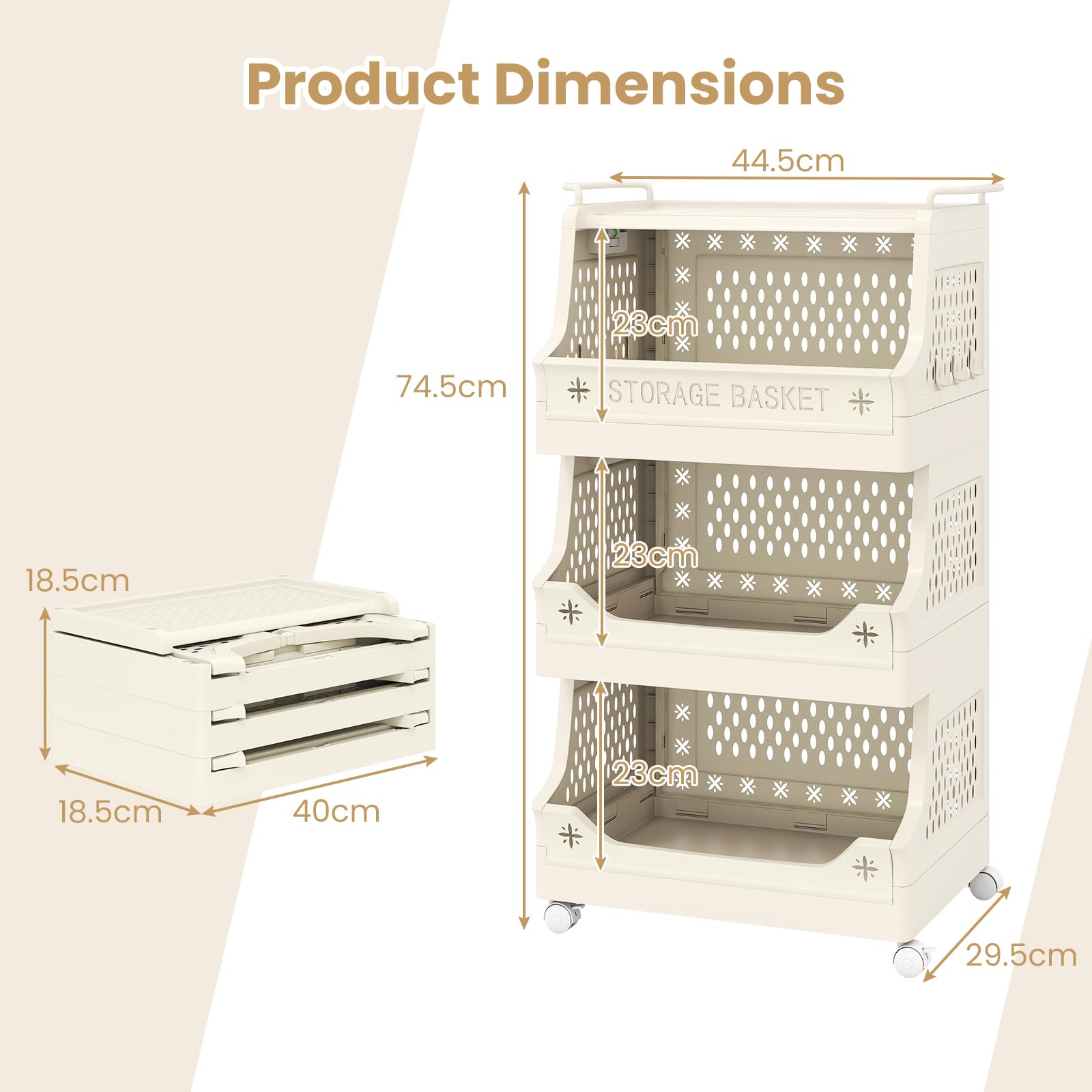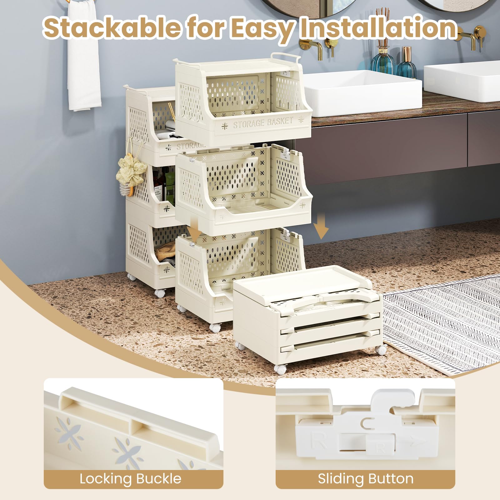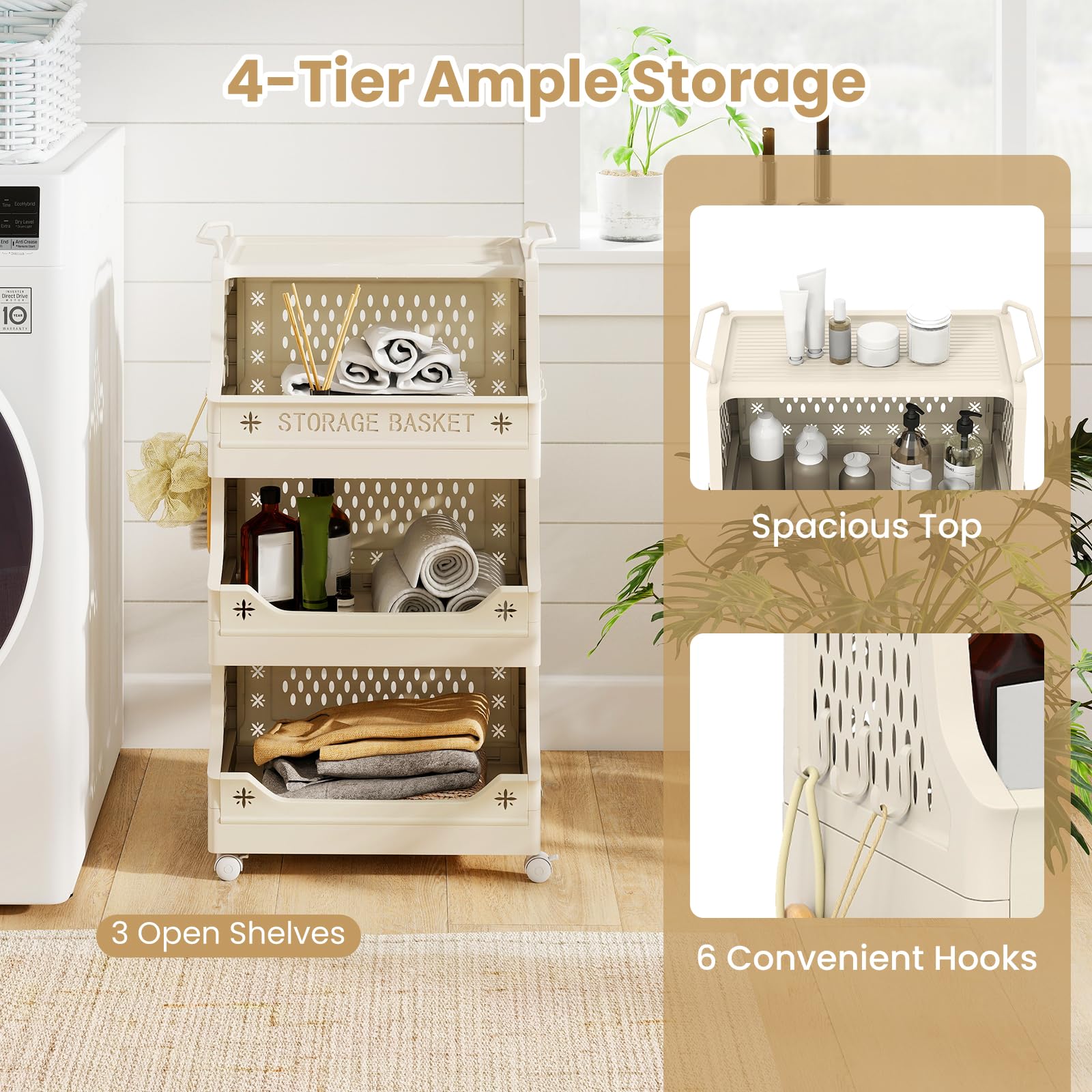 This versatile storage basket features 3 open shelves and a spacious top, complemented by 6 handy hooks for hanging items. Its breathable hollow patterns ensure proper ventilation, keeping your clothes fresh. Meanwhile, this laundry basket is equipped with 4 universal casters, 2 of which are lockable, and side handles for effortless maneuvering. Easy to assemble with a buckle design and a sliding button for fixation, it can also be quickly disassembled when not in use to save space. It can serve as a laundry basket, a bathroom organizer or a storage cart for various items. This is a multi-functional addition to your home, offering convenience and style.