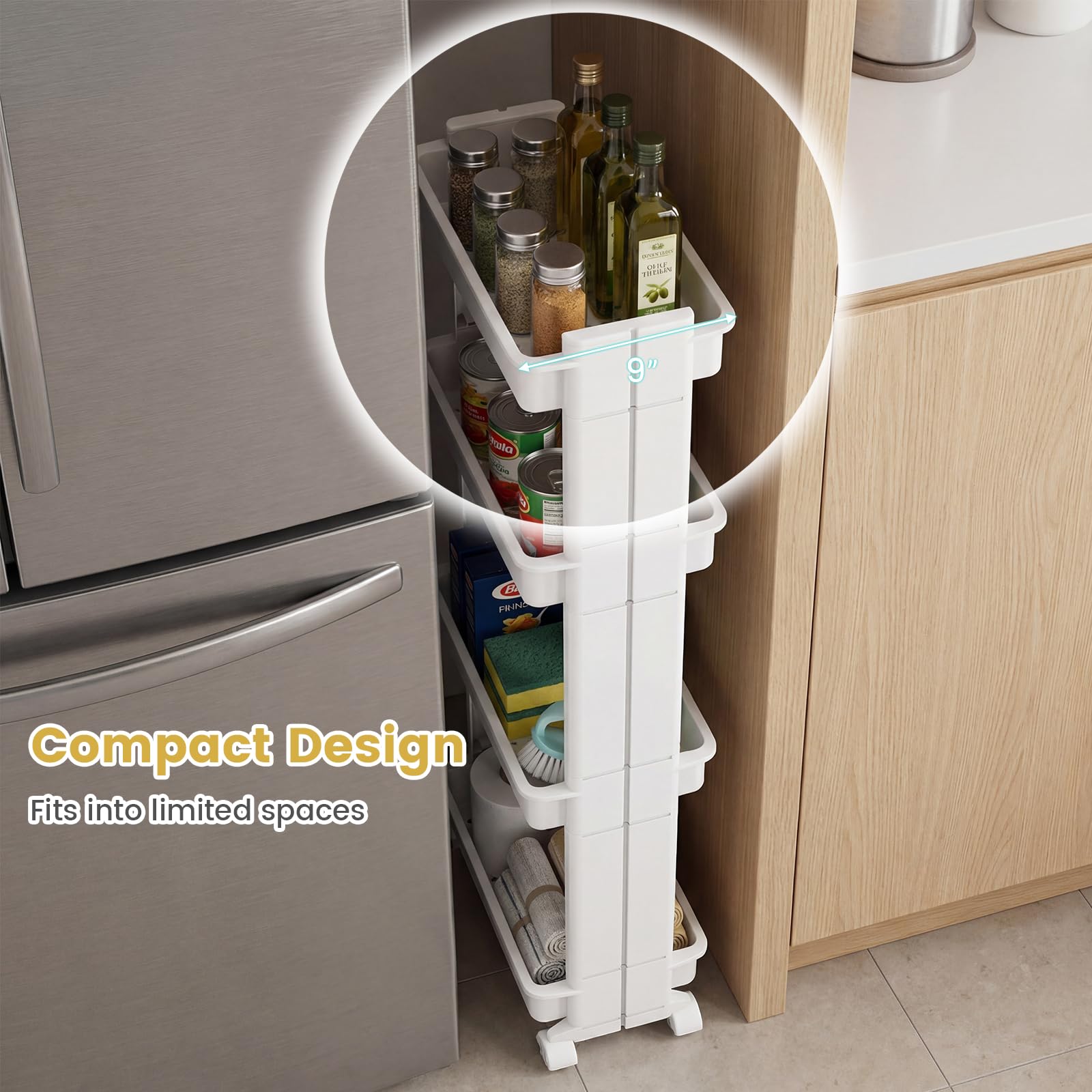 This kitchen storage cart is designed with multiple trays, keeps your items neatly organized and easily accessible. Moreover, these trays can be effortlessly detached, allowing you to customize the setup to suit your storage needs. Equipped with smooth-rolling casters, the mobile organizer glides seamlessly from room to room, whether it is the living room, bedroom, kitchen, or beyond. Additionally, the ventilated design improves airflow for enhanced practicality, allowing your belongings to stay dry and fresh.