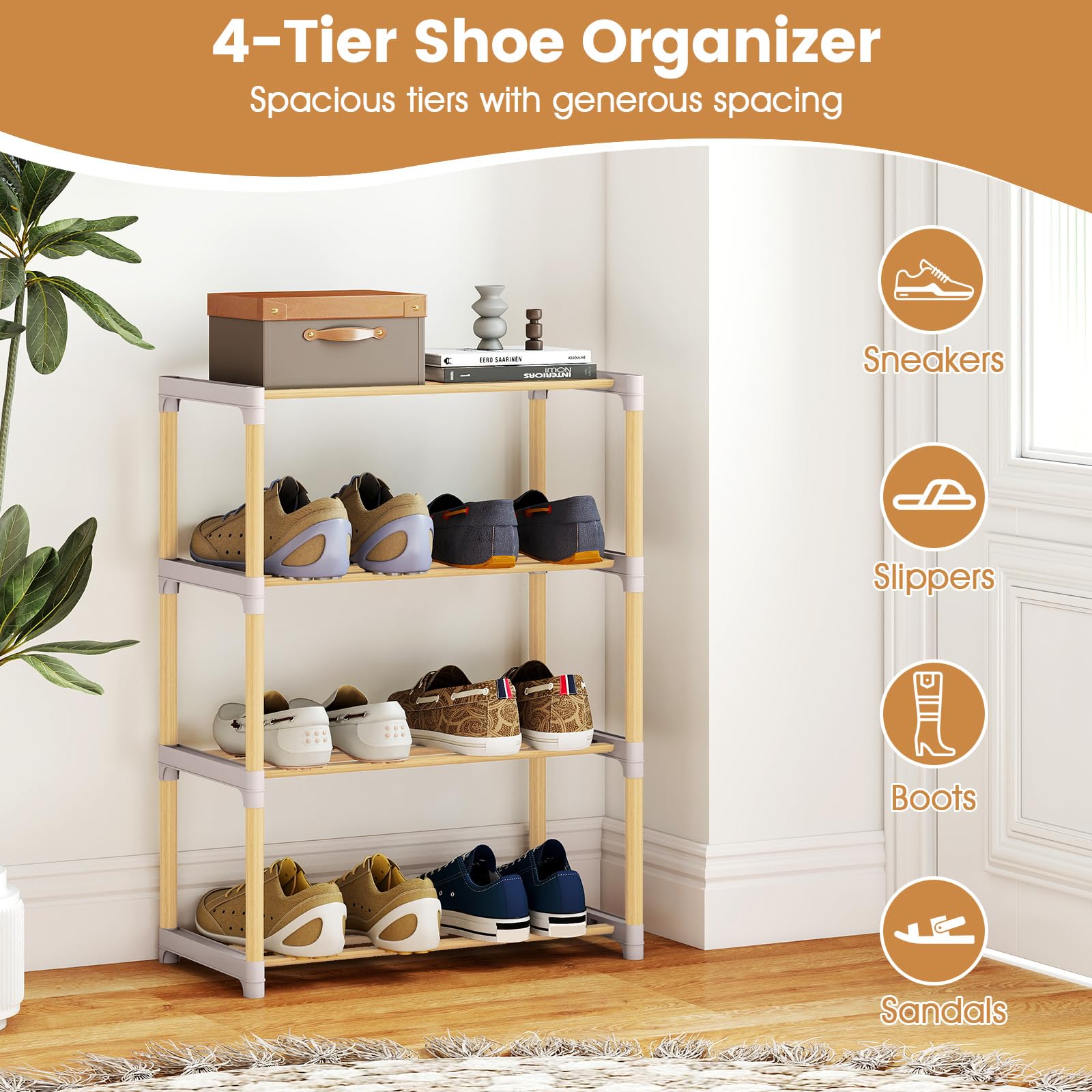 The solid pine wood frame offers lasting durability and a touch of natural beauty, making it a stylish addition to any space. With 4 slatted shelves, this shoe storage organizer provides ample room for all your shoes. The stackable design makes it easy to add or remove layers to fit your needs, ensuring flexible storage solutions. Reinforced PP connectors allow you to assemble the shoe stand quickly and effortlessly. Suitable for entryways, bedrooms, or closets, this shoe stand with thoughtful derails brings both function and elegance to your home.