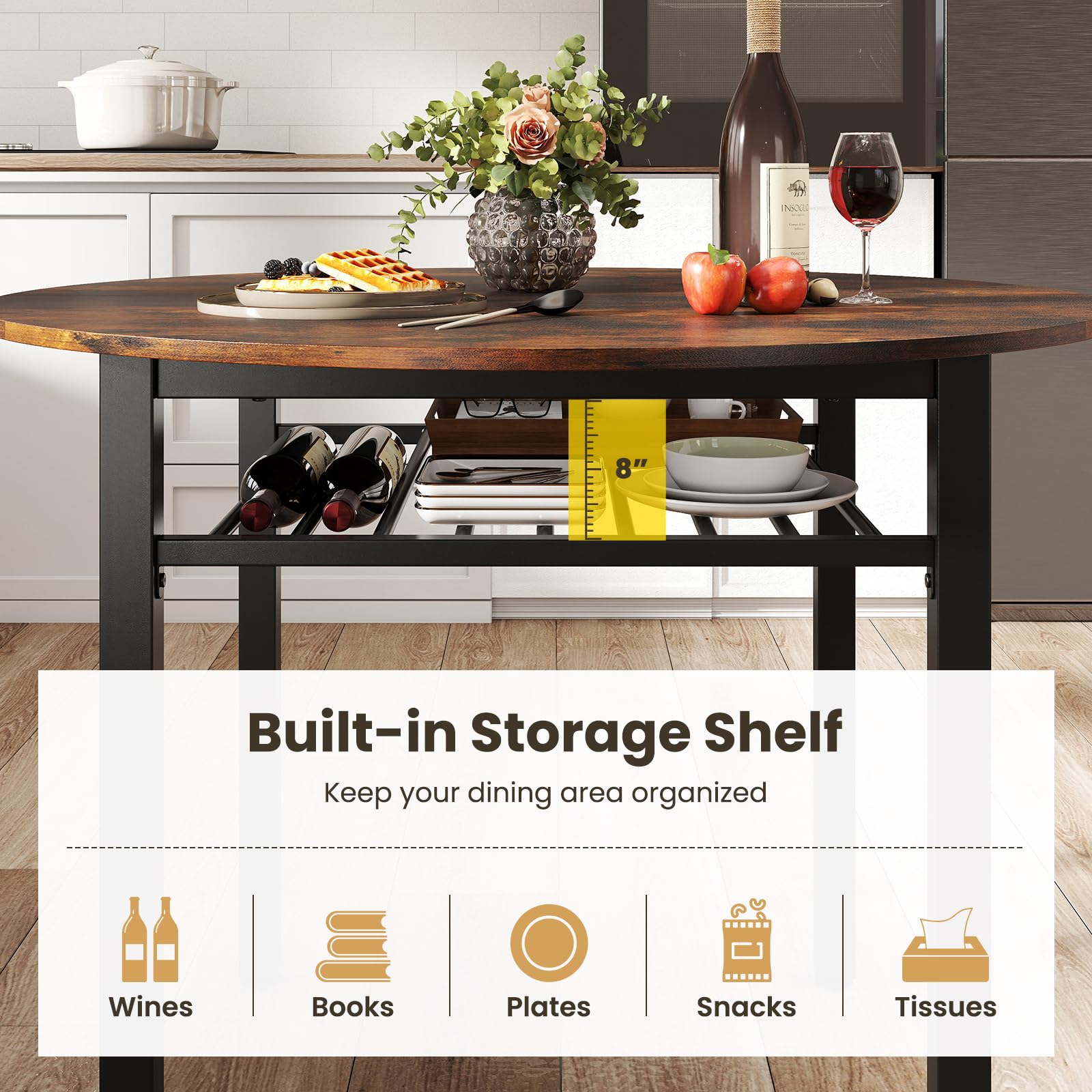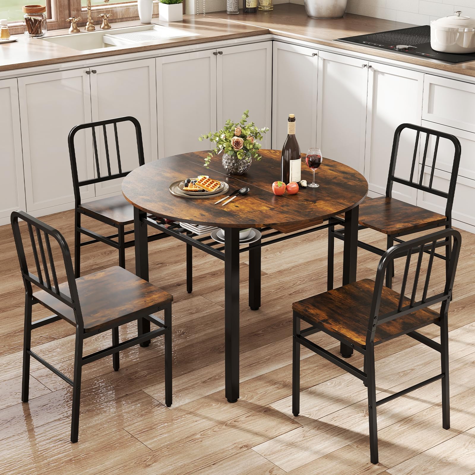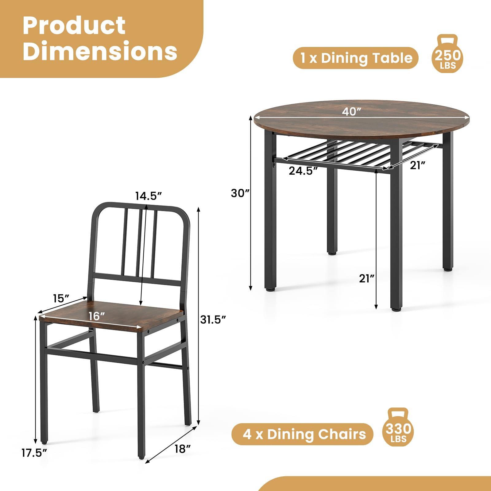 The kitchen chairs in the compact 5-piece dining set are ergonomically designed for an enjoyable dining experience. Moreover, the chairs can be conveniently tucked away underneath the table post-meal, making it perfect for smaller dining areas or living room. Additionally, the dining table set comes with a cleverly integrated storage rack beneath it, allowing you to efficiently arrange your dining necessities for easy access. Constructed with a metal frame, both the table and chairs offer exceptional durability and steadiness. Furthermore, the dinette table is topped with a veneer finish, simplifying the cleaning process.