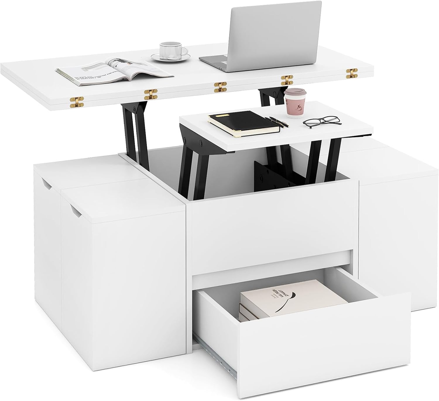 Hidden beneath the rising top, a generous compartment and 4 storage stools swallow remotes, linens, and board games whole, while the whisper-quiet hydraulic rod glides the surface from 17.5" to 24.5" and locks it securely for laptops or lattes. When the meal is over, the quartet of nested stools tucks completely under the frame, turning the lift coffee table with storage back into a sleek living room center table that frees up floor space in seconds. Crafted from premium-grade boards and supported by anti-slip foot pads, this convertible piece holds up to 165 lbs on its closed surface and ensures rock-solid stability for years of stylish service in any space.