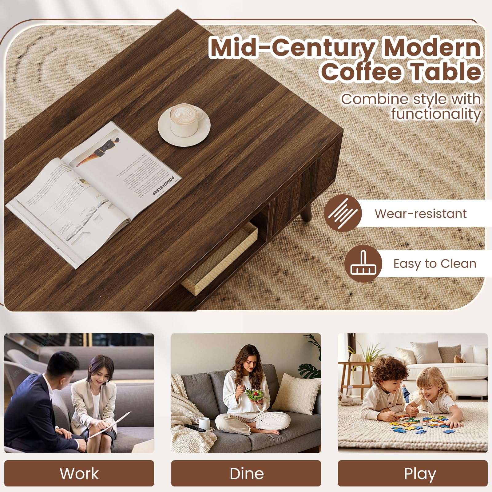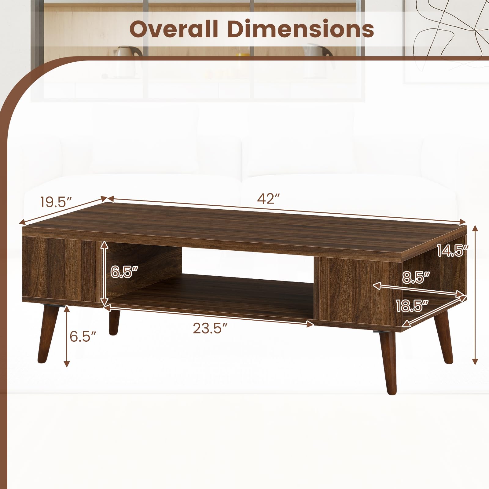 Enhance your living area with this mid-century coffee table, designed to combine classic charm with modern practicality. Offering a spacious tabletop alongside an open compartment and side shelves, the center table provides versatile storage solutions to keep your essentials organized. Supported by elevated solid rubber wood legs, this tea table ensures sturdy stability while allowing for easy cleaning beneath. Ideal for use as a cocktail table during social gatherings or as a functional centerpiece in your seating arrangement, this piece is perfect for those who appreciate both form and function in their home decorations.