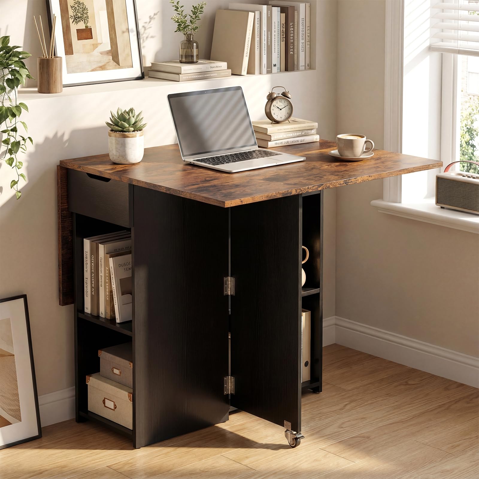Our extendable dining table with 2 drop leaf panels transitions effortlessly between compact and full sizes, making it ideal for apartment living or tight spaces. With 2 open shelves and an enclosed drawer, the dinner table provides practical storage solutions for organizing snacks, tableware, and decorations. Flexible hinges and lockable wheels enable smooth adjustments for dining, studying, or entertaining. The smooth wooden surface resists stains and wipes clean easily, while the sturdy construction and clear instructions ensure setup and care are simple for any household.