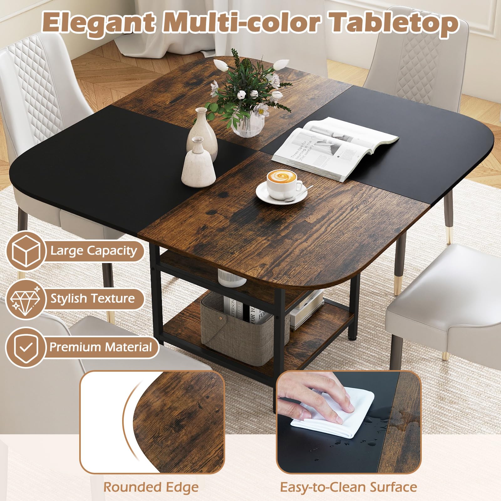 This elegant multi-color tabletop table features a wide surface, perfect for placing your daily items. The 2-tier storage shelves offer ample space for storing books, bowls, dishes, seasonings, and decorations, ensuring everything is within easy reach and your space remains tidy. The tabletop is crafted from high-quality board with a stylish mix-colored texture, adding sophistication to any room. Its smooth surface is easy to clean. Supported by thickened metal pipes, the table is sturdy and stable, with adjustable foot pads for added support on uneven surfaces. Measuring 47.5" x 47.5" x 30" (L x W x H), this versatile table is suitable for dining rooms, living rooms, and restaurants.