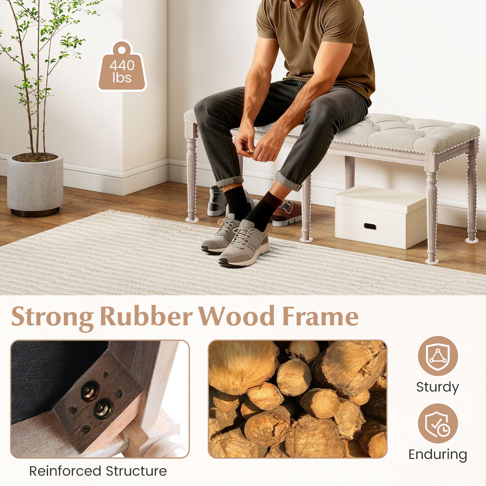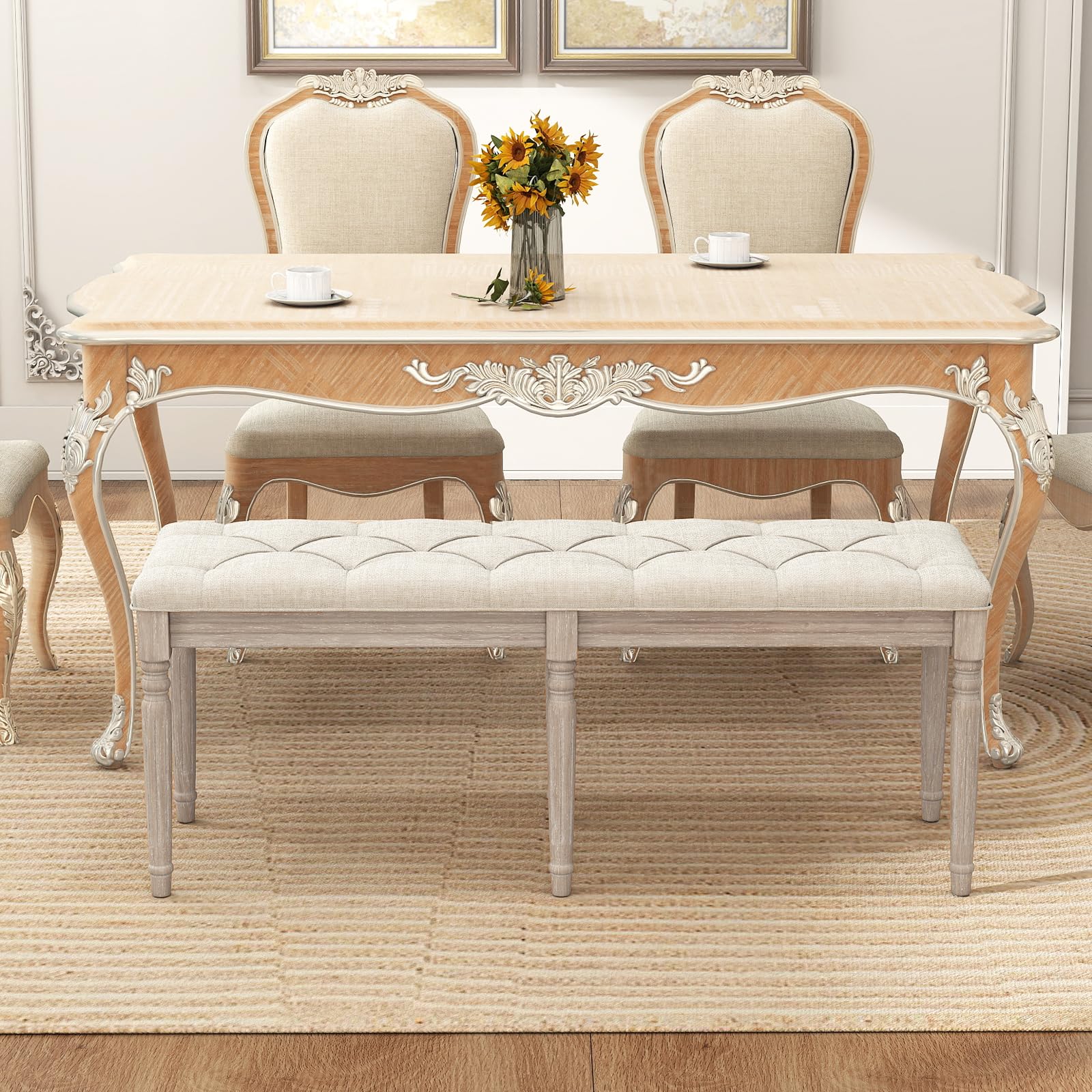 Crafted from premium rubber wood, this end of bench resists warping and cracking, also ensuring a smooth and splinter-free surface with great endurance. With a length of 47.5", it comfortably seats 2 people and supports up to 440 lbs, making it ideal for different users. Meanwhile, it features a luxurious thick cushion made of breathable linen and high-density sponge, offering optimal comfort for relaxation. Additionally, the dining bench's elegant vintage style, with button-tufted seat and carved legs, complements various indoor occasions. Versatile and multifunctional, this table bench can also serve as an entryway bench, piano bench, vanity stool or end-of-bed ottoman. It adds warmth and an inviting touch to any space, making it a must-have addition to any home.