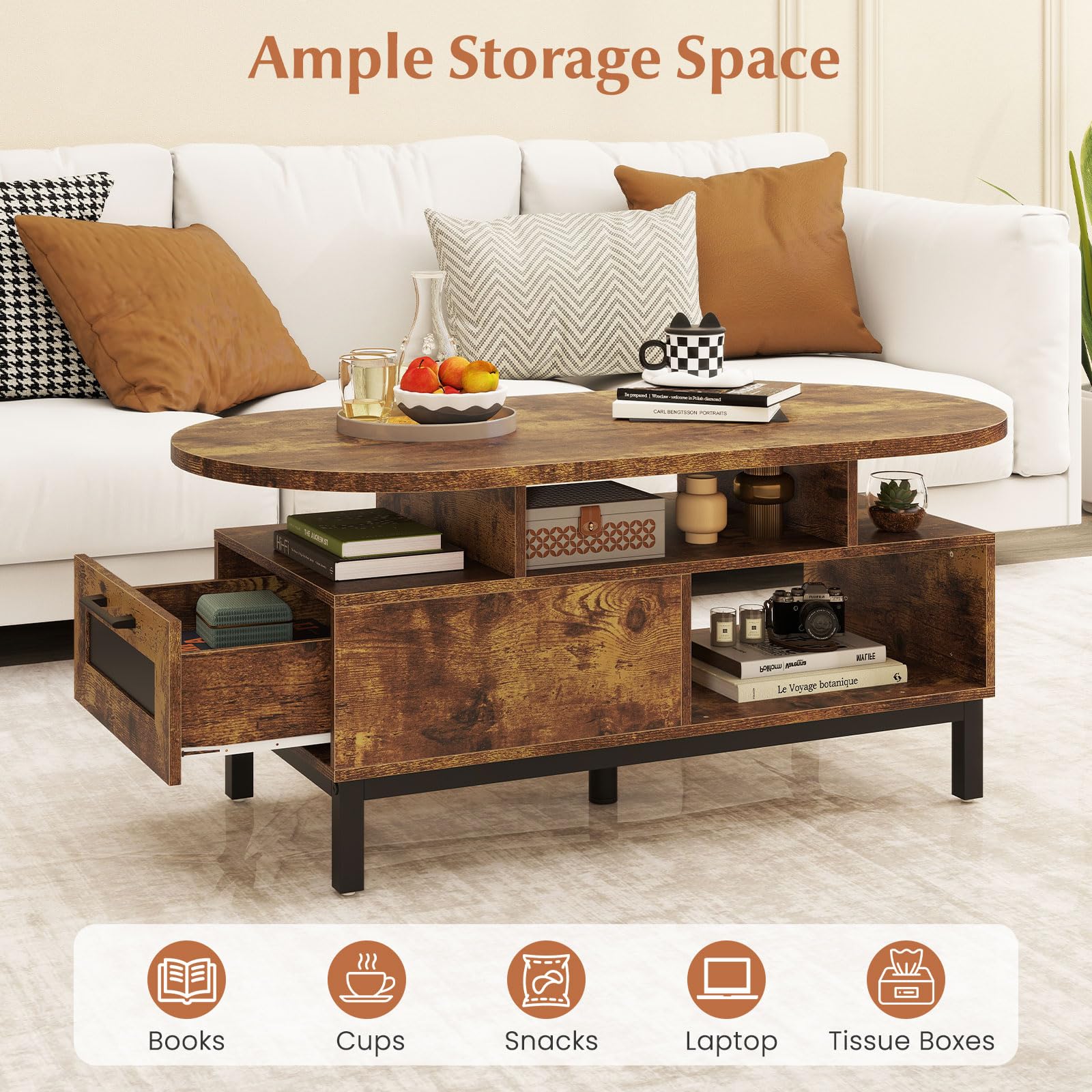 Unveil the secret to impeccable style and unmatched functionality with our chic oval coffee table. Perfectly sized at 47"L x 23.5"W, this masterpiece features a thick, round-edged top that gracefully hosts everything from your laptop to game-night battles. Hide away your clutter with the smooth-gliding drawer—perfect for remotes and gadgets! Dive into the spacious open shelves below, ideal for showcasing books and treasures, enhancing spaciousness and organization. Supported by 5 sturdy legs and styled with a sleek wood and matte-black finish, this center table ensures stability and a scratch-resistant surface that stays pristine. Bring home this blend of industrial flair and modern elegance that complements any interior. Bring it home for a living room transformation!