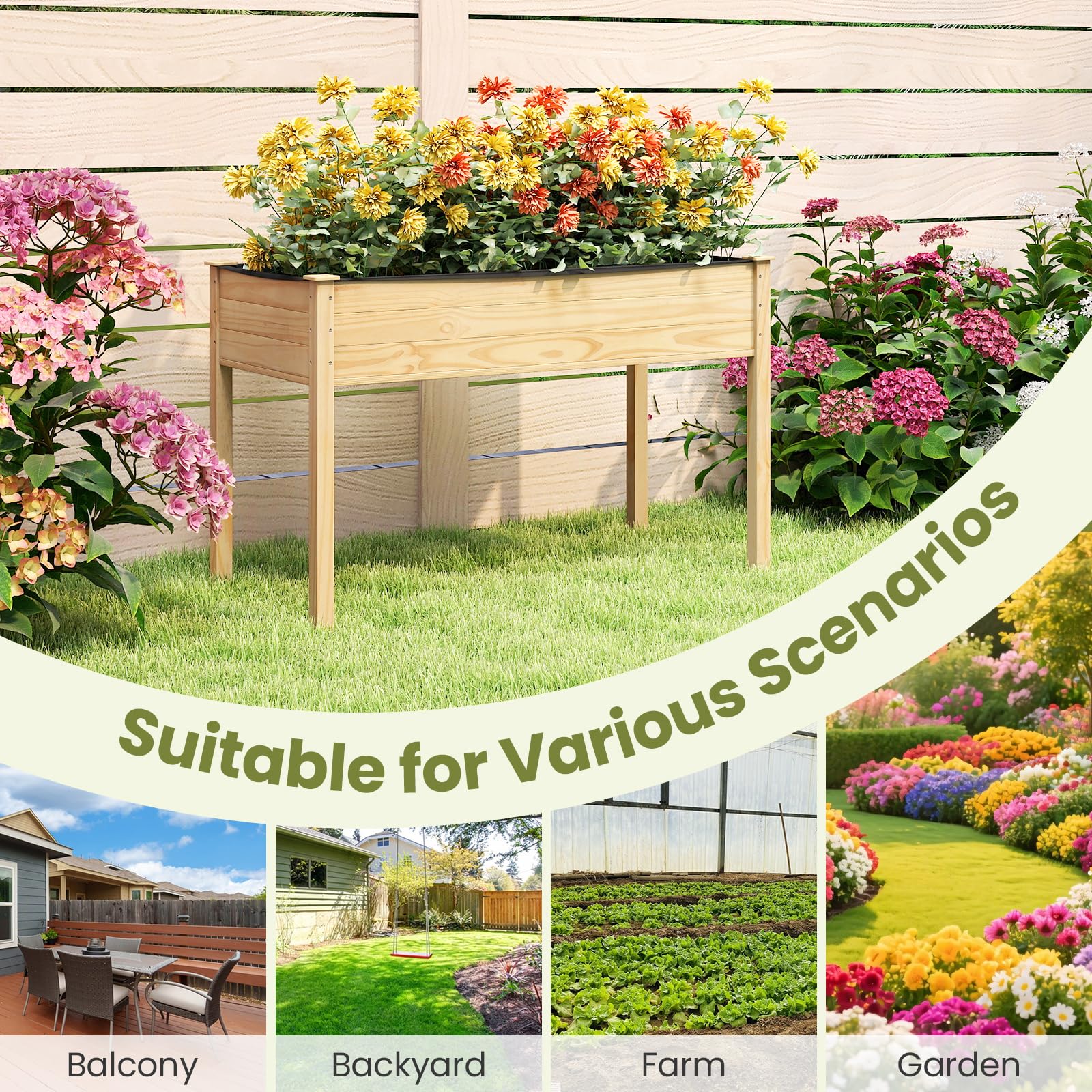 Constructed with selected pine wood, this wooden raised garden planter features solid wood construction that is sturdy, anti-deform, ensuring long-lasting reliability. The elevated planter box has a 30” raised height, which not only protects plants from wild animals but also reduces the need for squatting or bending down to water. Moreover, this raised garden bed includes a bottom drainage hole and liner fabric to provide good drainage and prevent over-watering. Suitable for various outdoor scenarios such as patios, gardens, farms, and balconies, this versatile planter box is ideal for growing fruits, vegetables, flowers, and herbs.