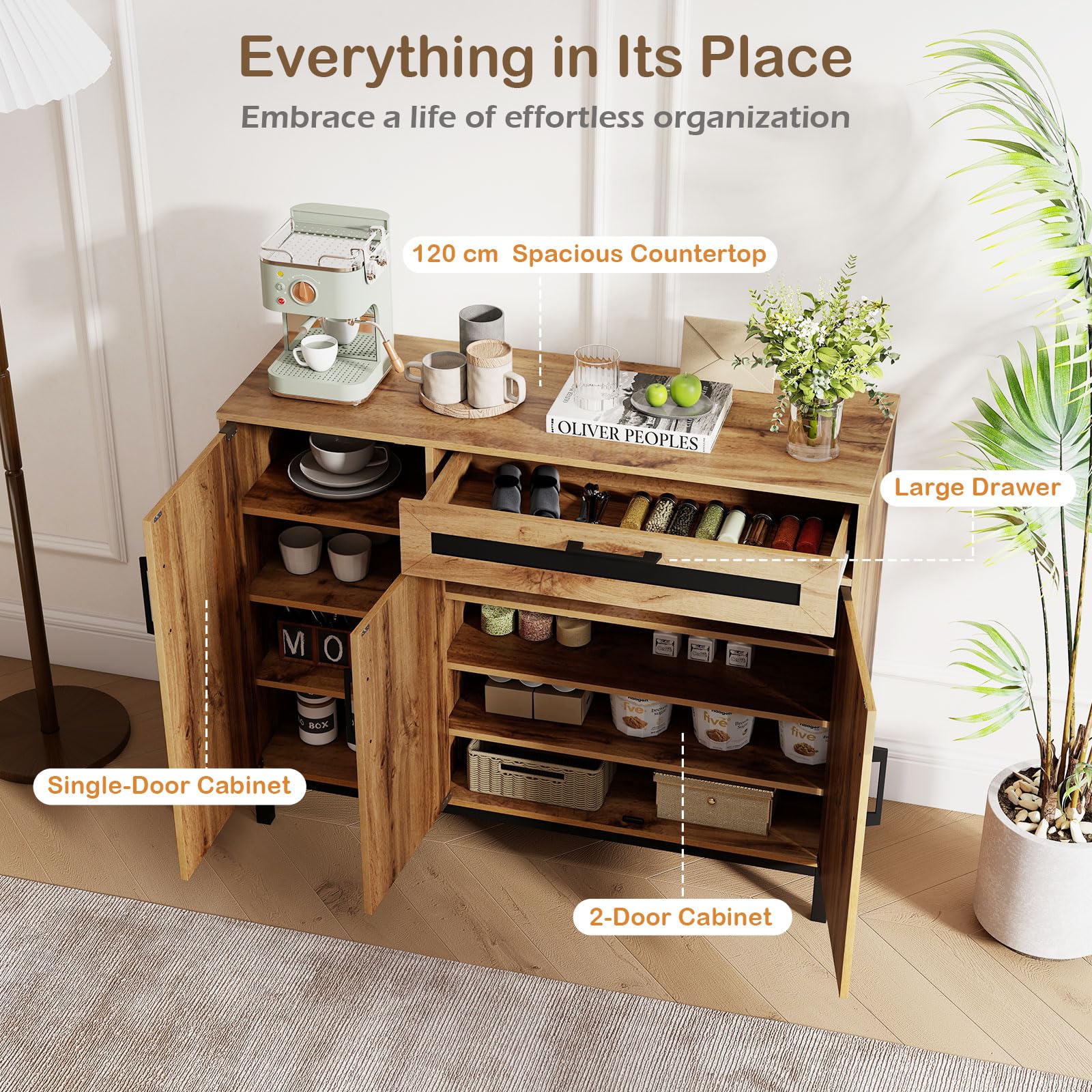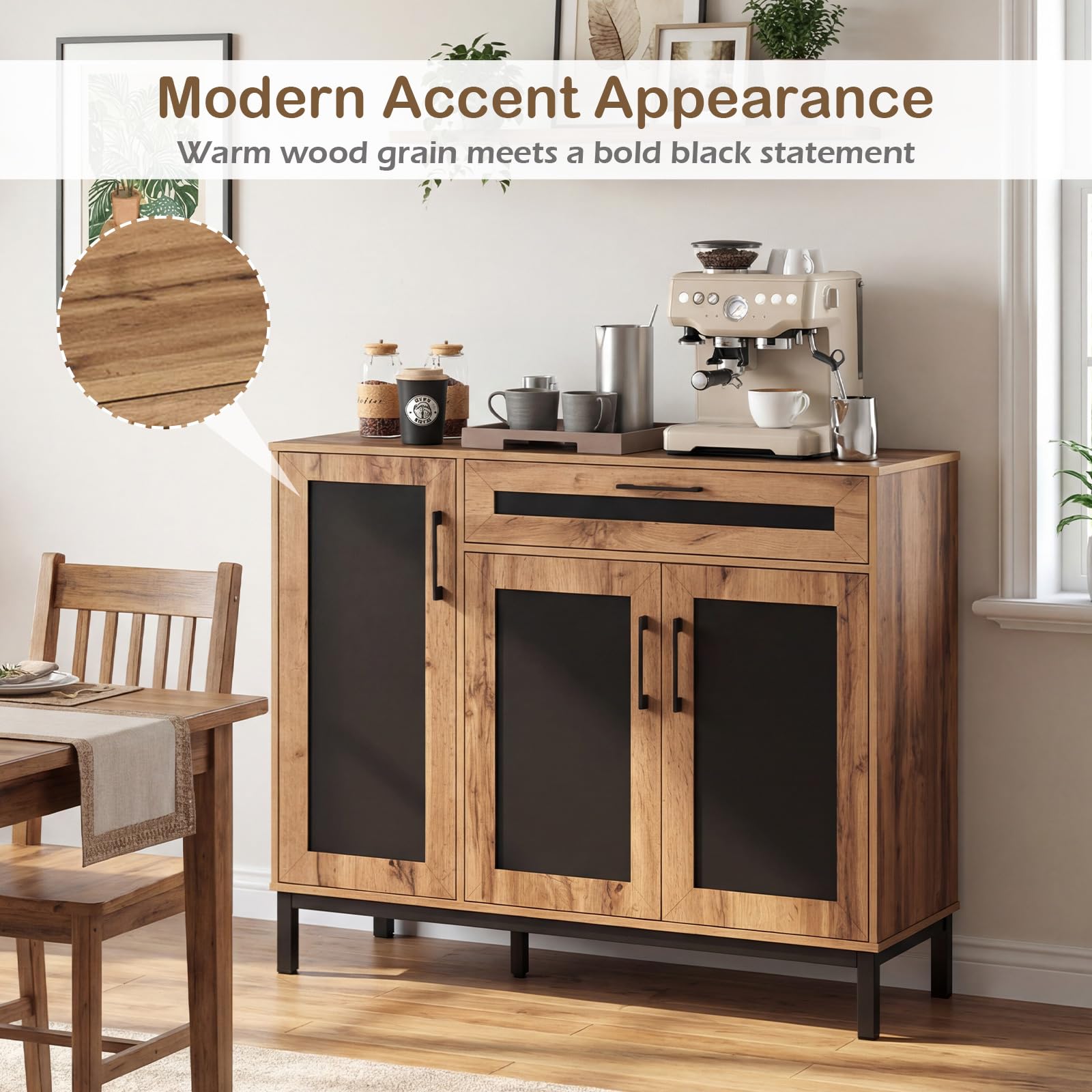 Featuring removable shelves inside, the buffet cabinet effortlessly fits talls or smalls with ease. The sturdy wooden frame includes an extra middle leg for enhanced stability and 2 anti-toppling kits to ensure safety. Moreover, the warm wood grain meets a bold black statement, making this cabinet eye-catching and perfect for multiple places. The smooth surface and elevated 4.5” clearance allow for easy cleaning, making everyday maintenance a breeze. Redefine your storage with this stylish and reliable storage organizer.