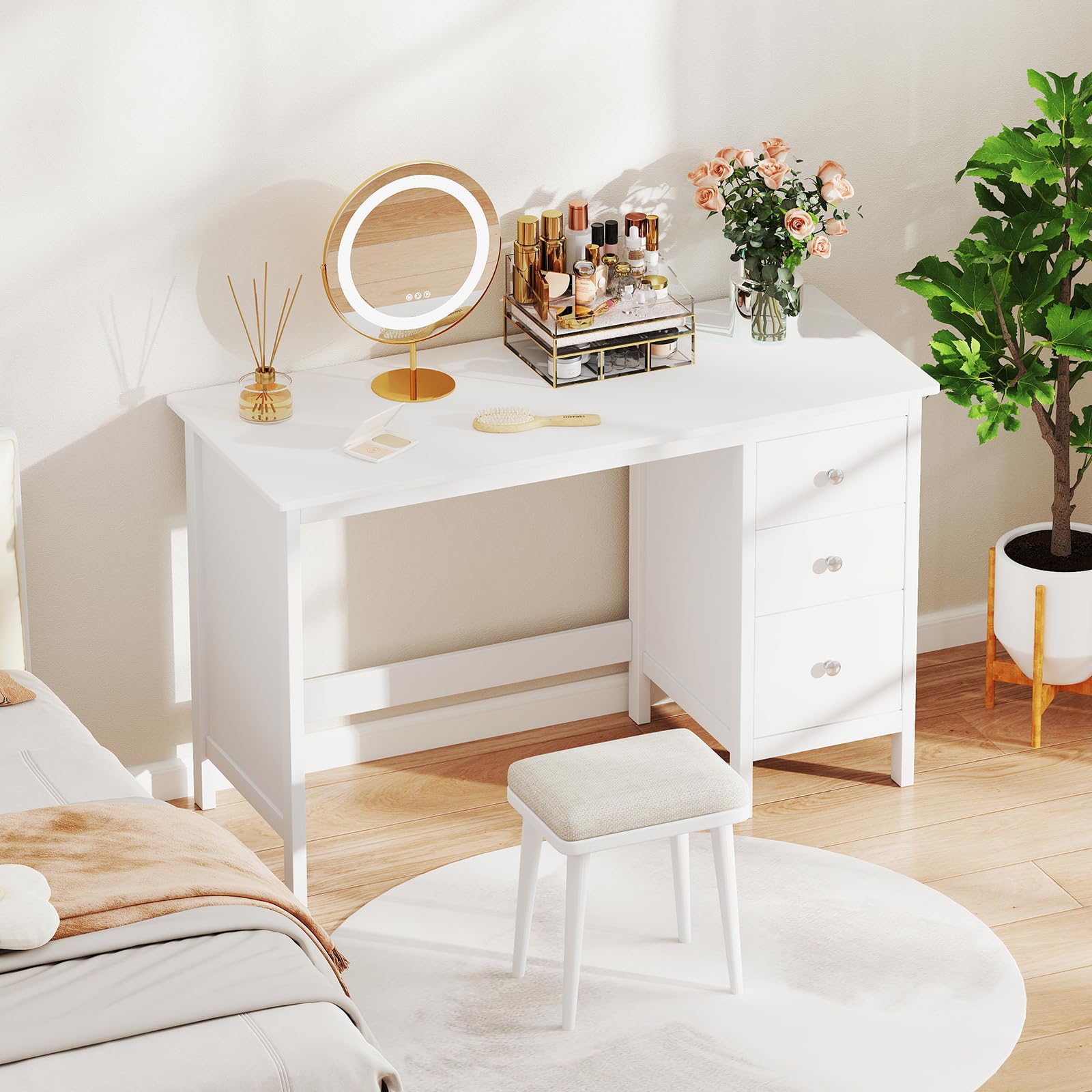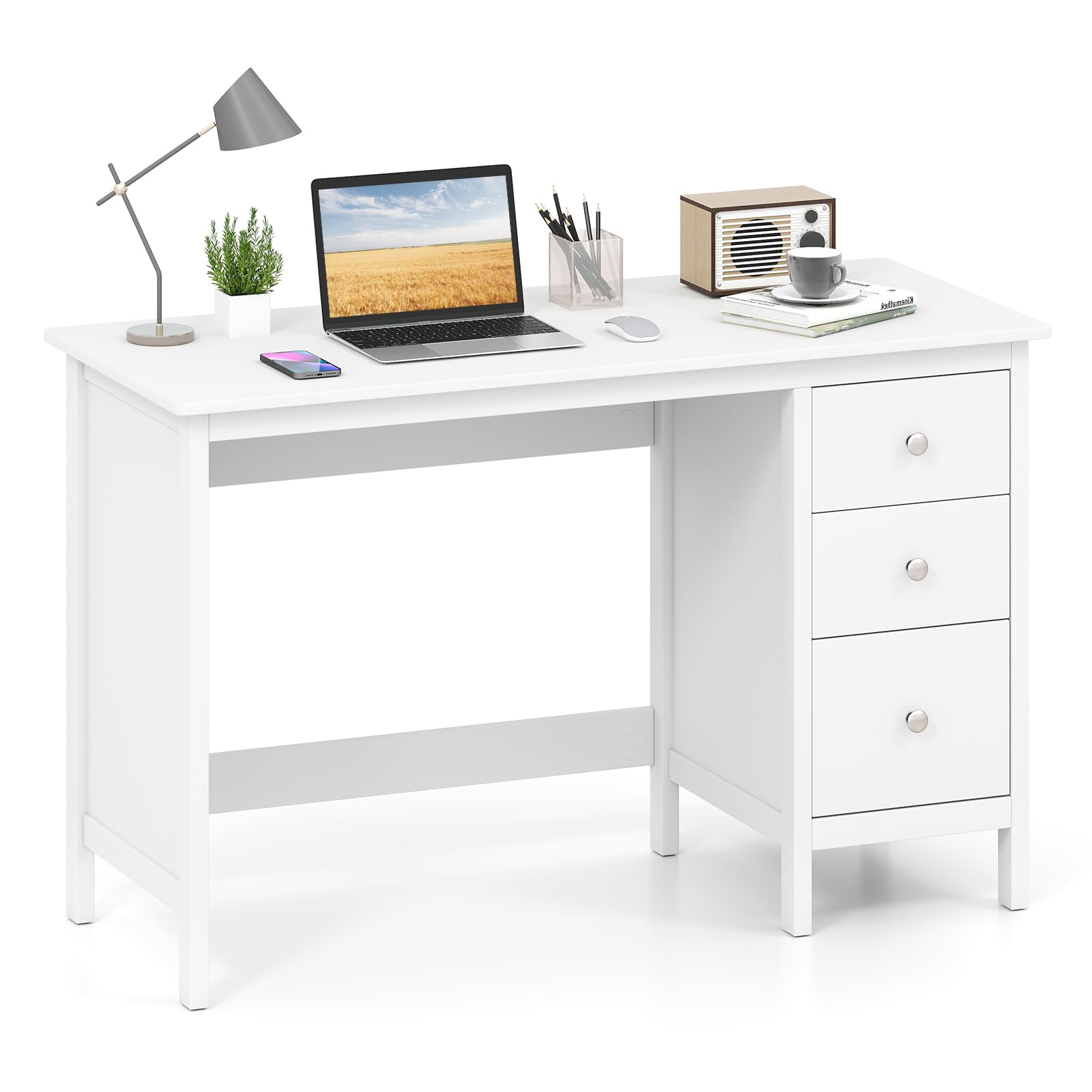 Spacious workstation can free you from messy surroundings and thus to help you concentrate on working for higher efficiency. Featuring 3 large drawers, this writing desk provides versatile storage options for all your office essentials. Safety is a top priority, which is why this computer desk features an anti-toppling device. Together with thickened board, the study desk is a reliable addition to your living space. In addition, whether used for study, bedroom or office, the desk will be of great satisfaction.