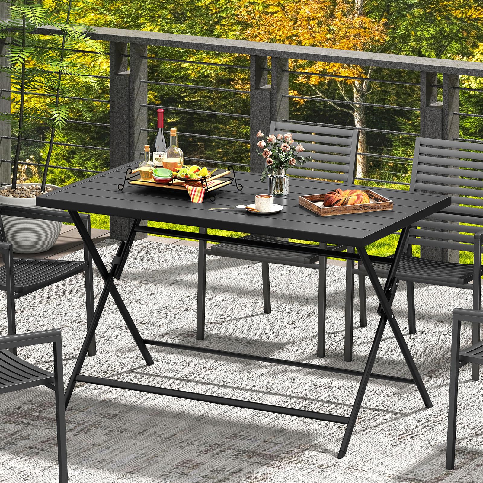 With its generous tabletop size and clean rectangular shape, it provides a practical surface for meals, activities, and social occasions. It features a fast-folding design with a safety latch for easy setup and compact storage, making it especially suitable for homes with limited space. Supported by a sturdy metal frame and equipped with non-slip foot pads, it ensures reliable stability. The slatted metal tabletop promotes airflow, prevents water buildup, and allows for effortless maintenance. Whether placed in the garden, backyard, balcony, kitchen, or dining area, it offers flexibility and convenience for daily use.