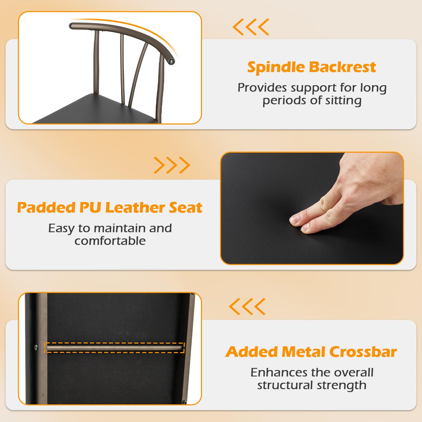 Designed for comfort, the spindle backrest of the kitchen chairs offers ample support for extended sitting periods. Furthermore, the padded PU leather seats are not only easy to maintain but also provide a cozy seating experience. Featuring sturdy 3-point supporting metal legs, the 5-piece dining table set exudes both elegance and robustness. Also, the 1.6" thickened board of the dining table enhances sturdiness, while large non-slip pads further enhance the stability. Additionally, the 4 chairs can be tucked under the table when stored, making it an economic choice for apartment or small dining areas.