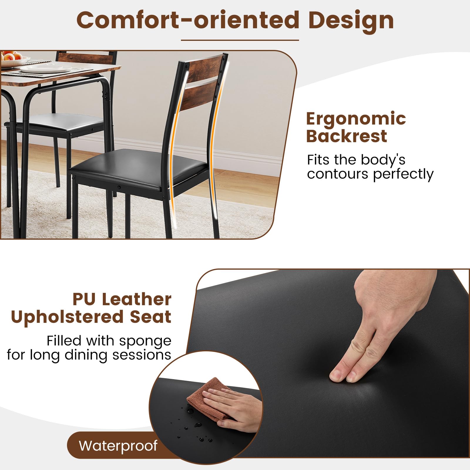 Crafted with comfort and style in mind, the ergonomic backrest of the chairs perfectly contours to the body, providing optimal support during long dining sessions. The seats are upholstered in waterproof PU leather and filled with sponge, offering upgraded comfort. Constructed with a robust metal support frame, the kitchen dining set ensures stability and durability for years to come. Non-slip foot pads protect your floors from scratches. Plus, the 4 dining chairs can be conveniently stored under the table after the meal to save space. With rustic wood-like texture on the tabletop, the 4 people dining set is ideal for various settings, including the kitchen, restaurant, and apartment.