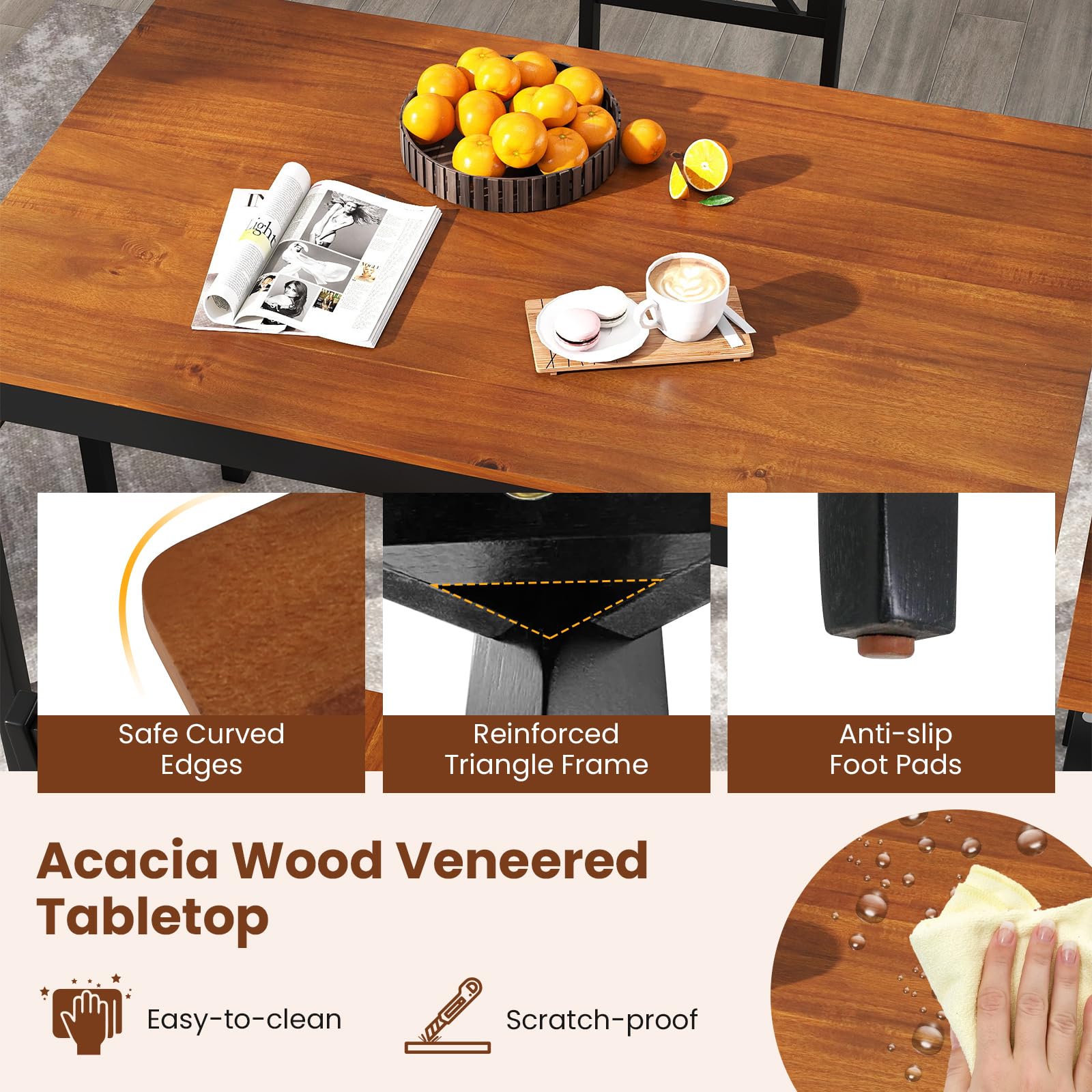 The 5 pieces dining set features natural rubber wood legs designed to resist cracking over time, ensuring enduring support. Plus, the chairs offer an ergonomically angled backrest to encourage comfortable and healthy seating posture, complemented by ventilated cross backs that allow for airflow. Enhanced chair stability is achieved through additional crossbars, supporting weights up to 420 lbs. The tabletop, finished with an acacia wood veneer, provides a surface that resists scratches and is simple to maintain. Underneath, a reinforced triangular frame strengthens the table's overall stability. 4 chairs can be configured to suit different spaces or stored under the table when not in use.