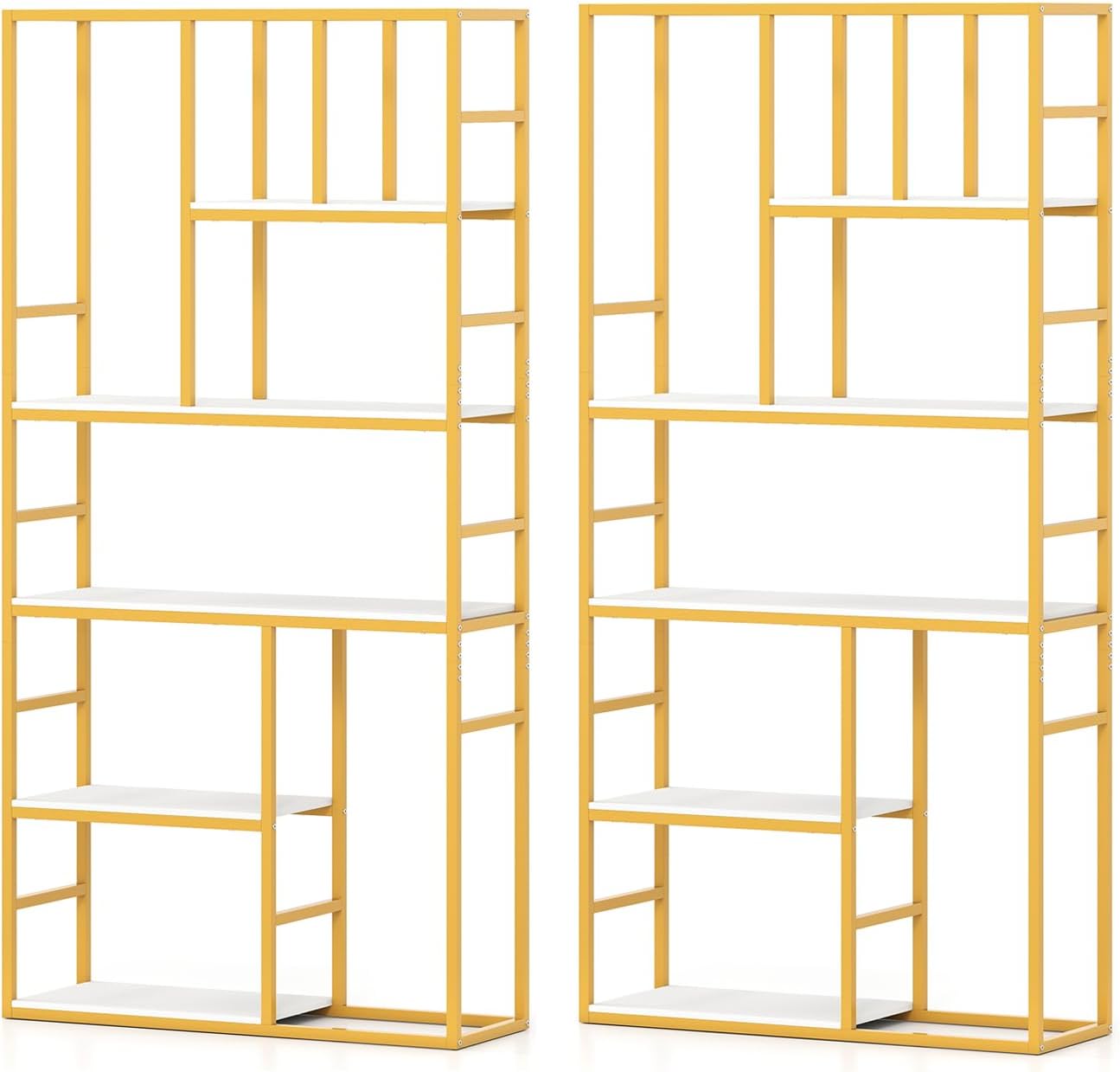 The tall bookshelf features a sleek gold and white design that adds a touch of modern elegance, making it a stylish addition to your living room, bedroom or office. Offering 5 spacious open shelves, it provides ample room to neatly display books, plants, photo frames, magazines and decorative items while keeping your space organized. Safety is a priority with 2 anti-tipping devices that secure the unit firmly to the wall, ensuring stability in busy environments. Built with a robust metal frame measuring 0.78" thick and equipped with anti-slip foot pads, this bookshelf is both enduring and floor-friendly.