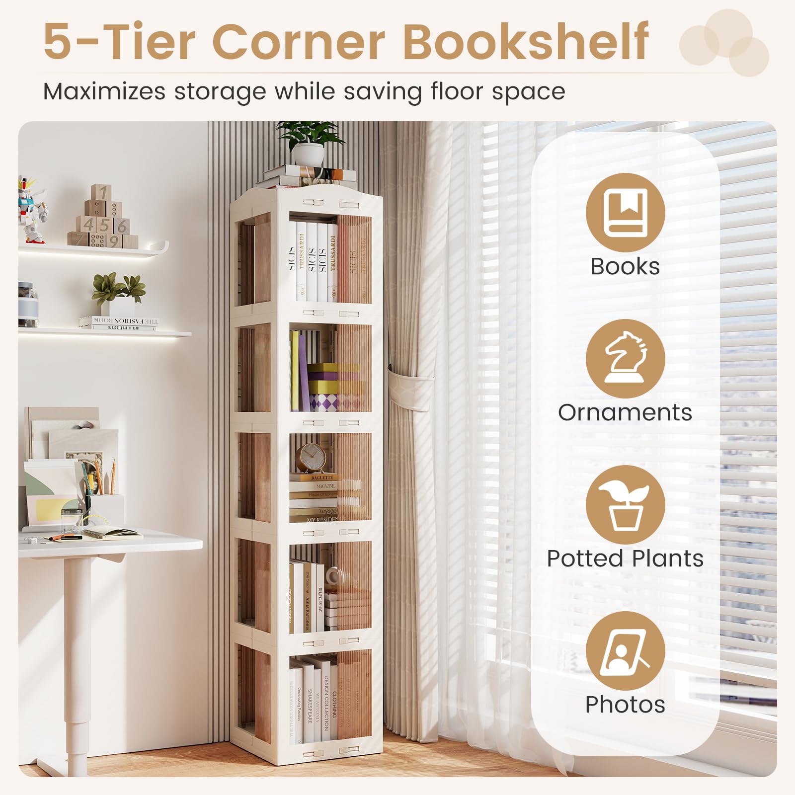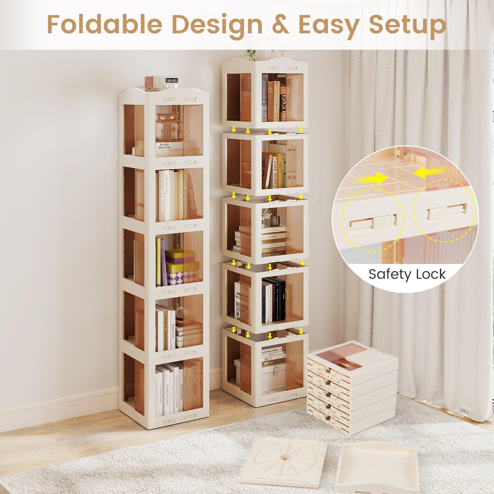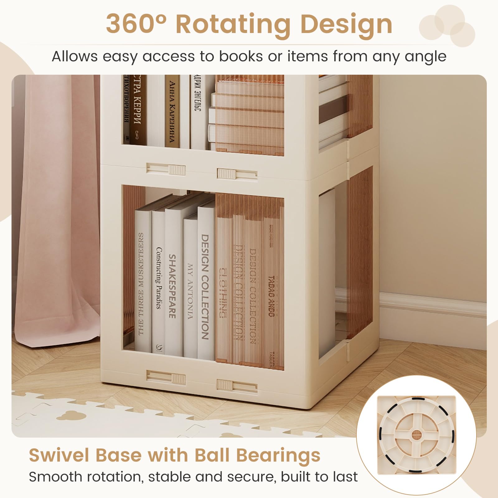 This rotating bookshelf is designed to maximize space while offering easy access to your favorite books and decorative items. Featuring a 360° swivel base, this bookcase allows for smooth rotation, enabling you to browse your collection effortlessly from any angle. Its foldable structure adds versatility, making it convenient to store when needed. Crafted with translucent panels, this storage organizer blends subtly into your space. The corner-friendly shape helps utilize often overlooked spaces, making it a practical choice for various spaces where efficient storage solutions are essential.