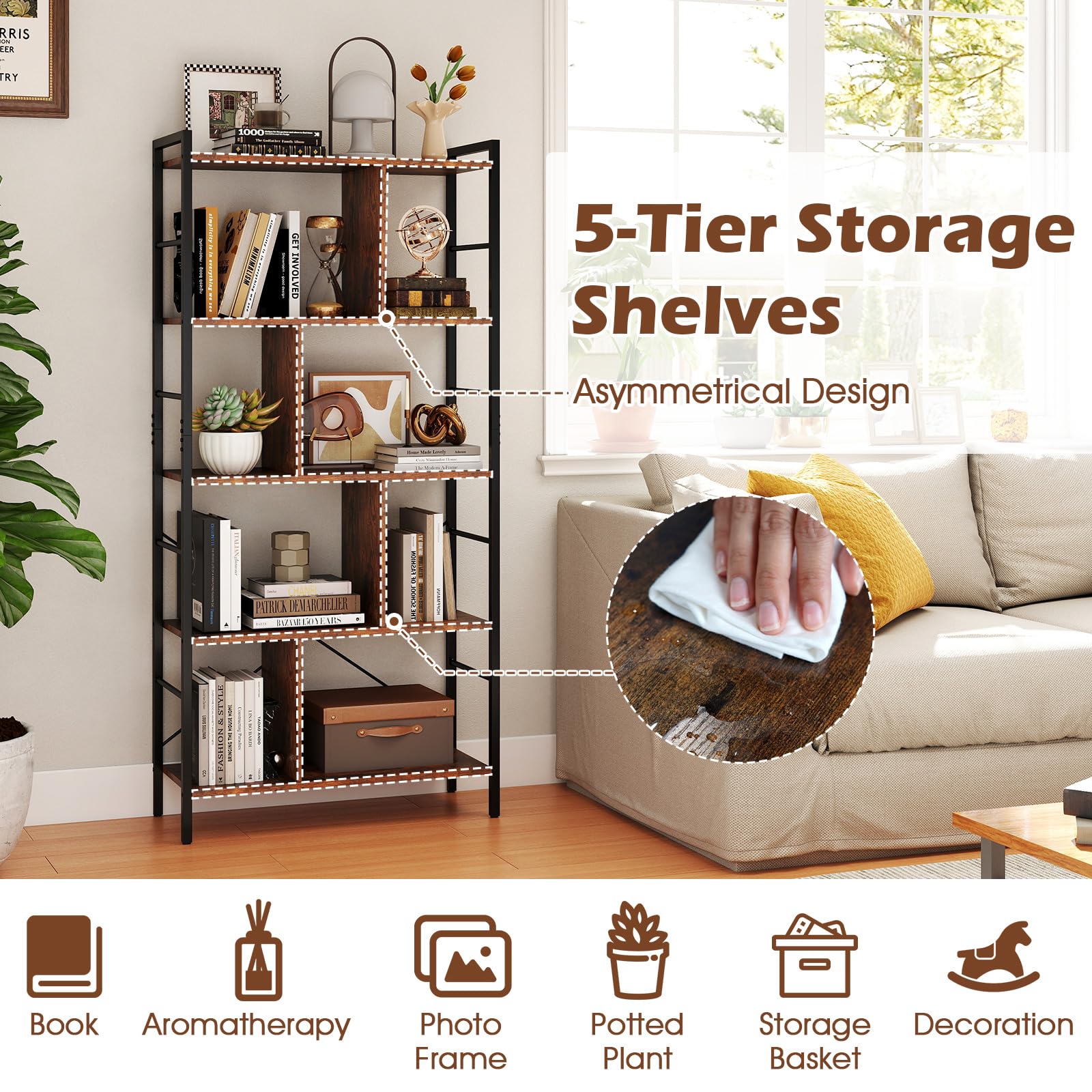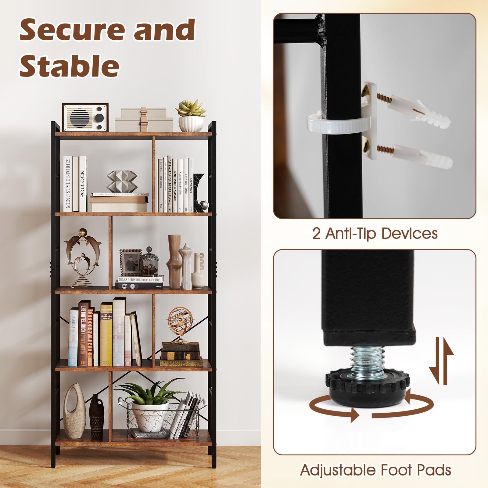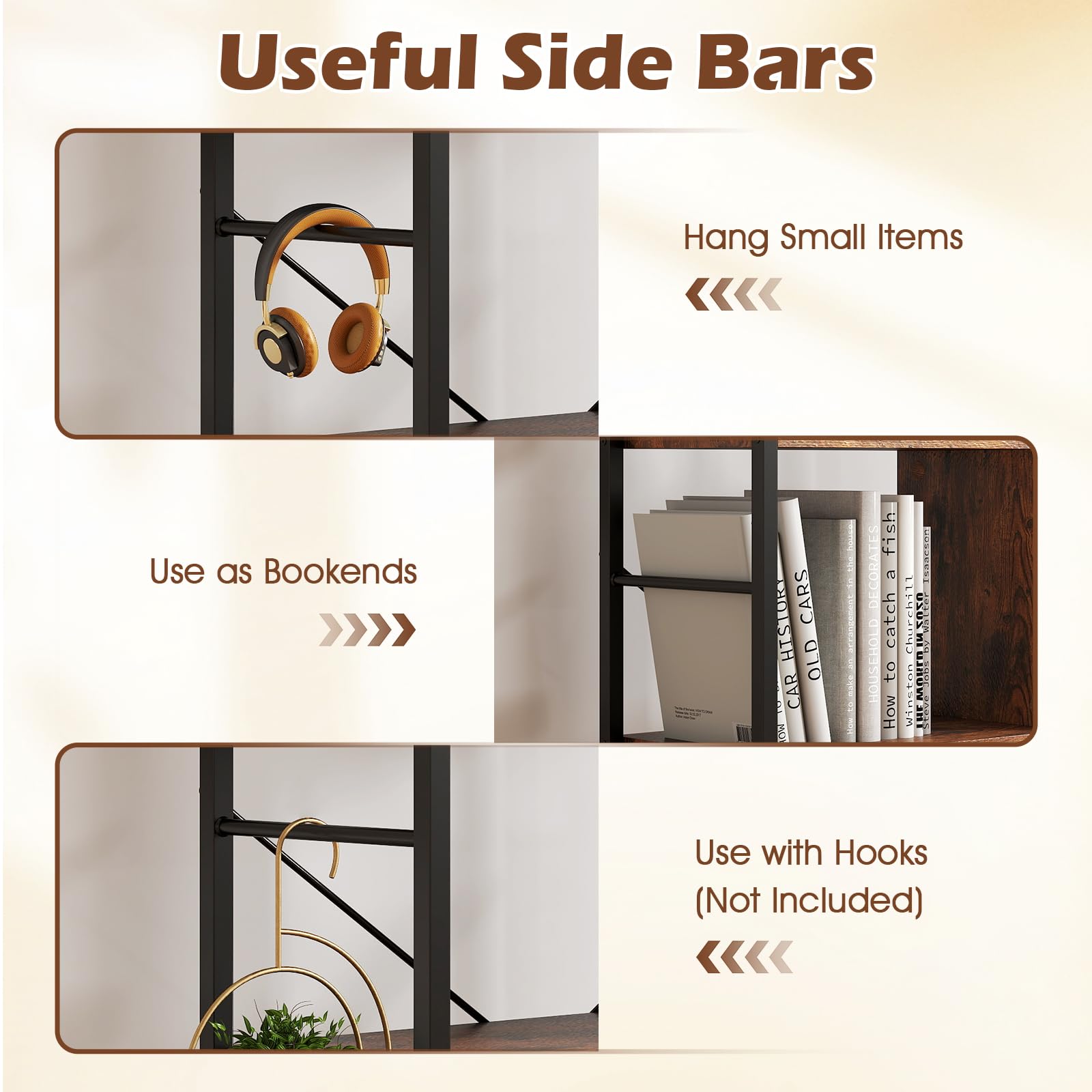 This 61" bookshelf offers 5 roomy shelves, giving you plenty of space for collectibles, storage baskets, aromatherapy, favorite reads, and plants. The metal frame and thick boards handle up to 220 lbs without wobble, thanks to sturdy supports and anti-tip devices. Besides, the side bars offer handy hanging spaces for bags or headphones. Bring a touch of modern industrial to your space while keeping everything you love neat and easy to reach!