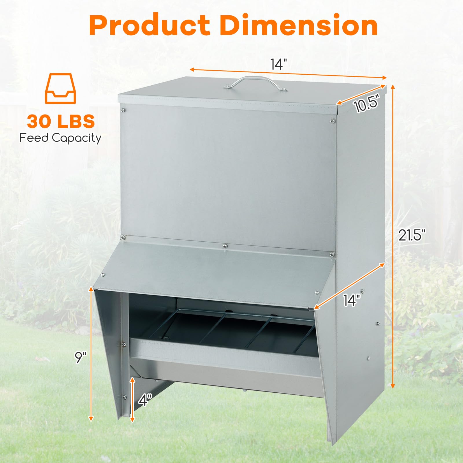 The high-capacity feeder is designed to hold 30 lbs of feed, significantly reducing the need for frequent refills. Plus, the openable lid with a handle is a thoughtful addition simplifying daily operations such as refilling and cleaning. The feeder with a semi-enclosed trough will enhance efficiency by minimizing feed wastage. The awning will keep the food protected. Crafted from galvanized steel, the poultry feeder not only offers exceptional sturdiness but also boasts rust-resistant properties. Additionally, the no waste chicken feeder is equipped with 2 pre-drilled holes on the back, providing flexibility in how you choose to position it. Therefore, the outdoor metal feeding trough is well-suited for chickens, ducks, and geese.