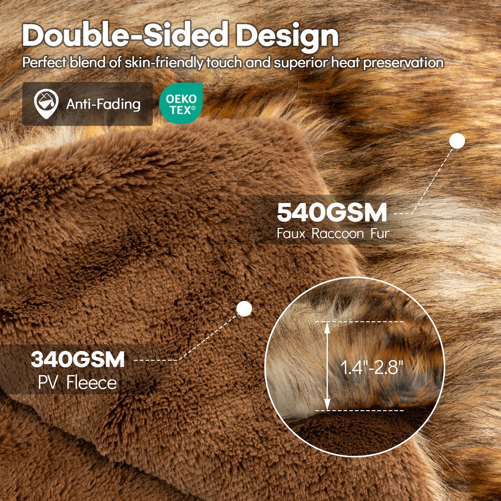 Wrap yourself in the ultimate warmth with this sumptuous faux fur throw, boasting a plush exterior of faux raccoon fur measuring 1.4”-2.8” long and a silky soft fleece lining. Crafted from heavyweight 540GSM faux fur and featuring a double-sided design, this cozy blanket locks in heat, perfect for chilly nights. Its rich texture adds a touch of sophistication, effortlessly enhancing any sofa, bed, or armchair. Designed for modern living, this OEKO-TEX certified throw resists fading and requires minimal care. Find your perfect fit, measuring a generous 60”L x 80”W, it is ideal for gifting on special occasions like birthdays, holidays, or housewarmings.