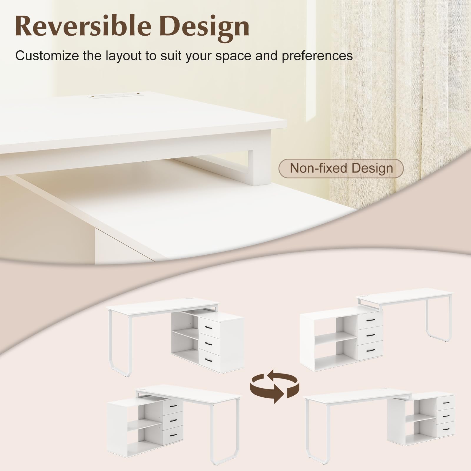 The reversible design allows you to set up the computer desk in either an L-shape or a straight configuration, with the longer side on the left or right, adapting perfectly to your space and preferences. The built-in charging station keeps your essential devices charged while minimizing cable clutter for a tidy workspace. The spacious L-shaped desktop easily accommodates 2 monitors along with additional