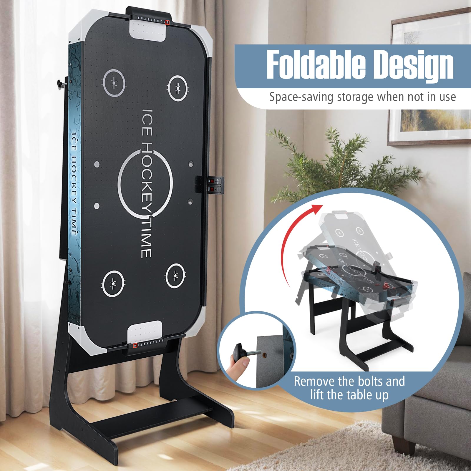 Experience endless fun with this 54-inch LED air hockey table, designed for players of all ages. Its high-performance 12V motor and precision air holes ensure smooth, fast puck action, while the easy-to-read digital scoreboard keeps track of every goal effortlessly. Built with protective corners and reinforced crossbars, it stays stable on any surface. The foldable design saves space, making setup and storage simple. Perfect for family game nights, playrooms, or as a gift, it combines excitement, skill-building, and quality time in one.