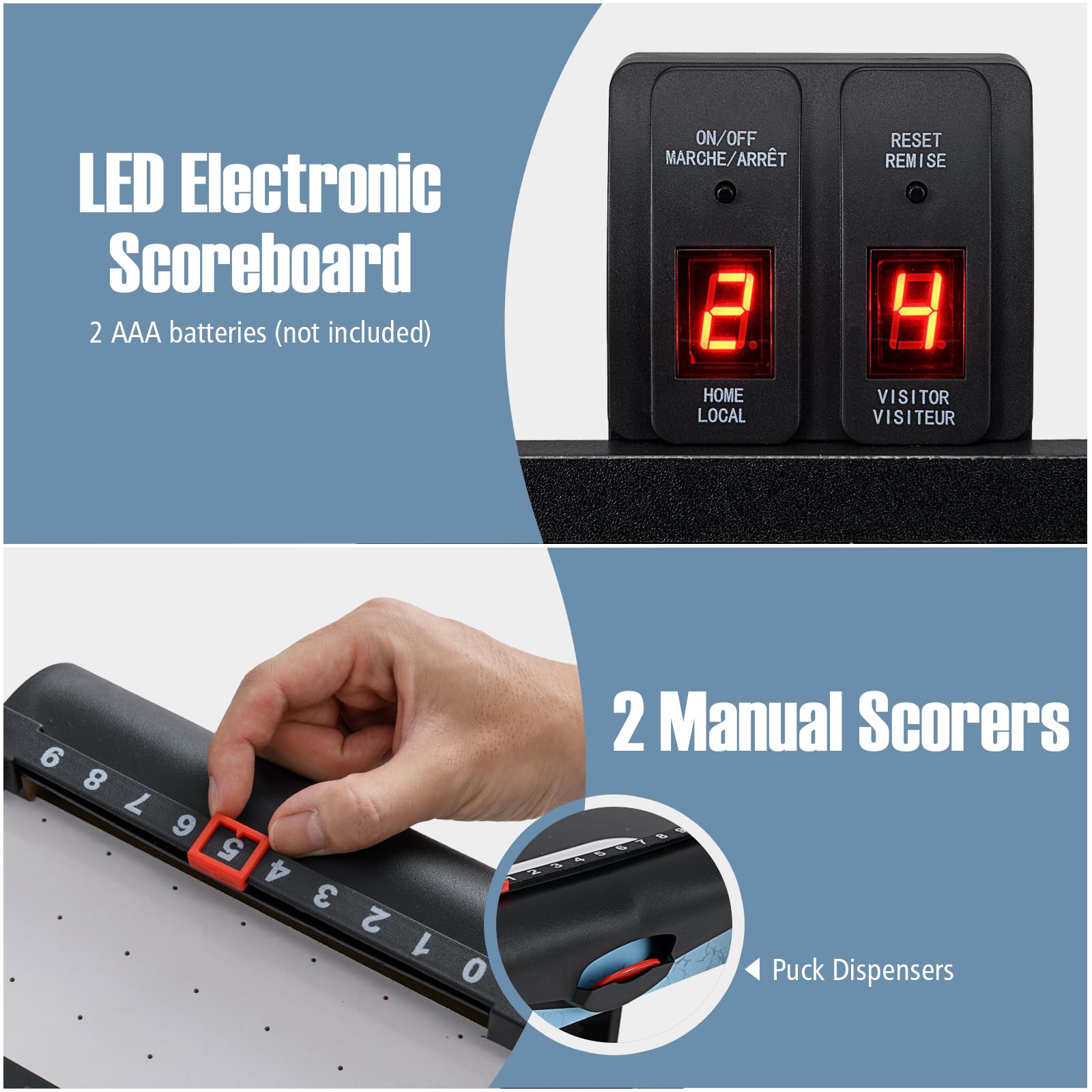 Flashing LED lights add excitement when a goal is scored
