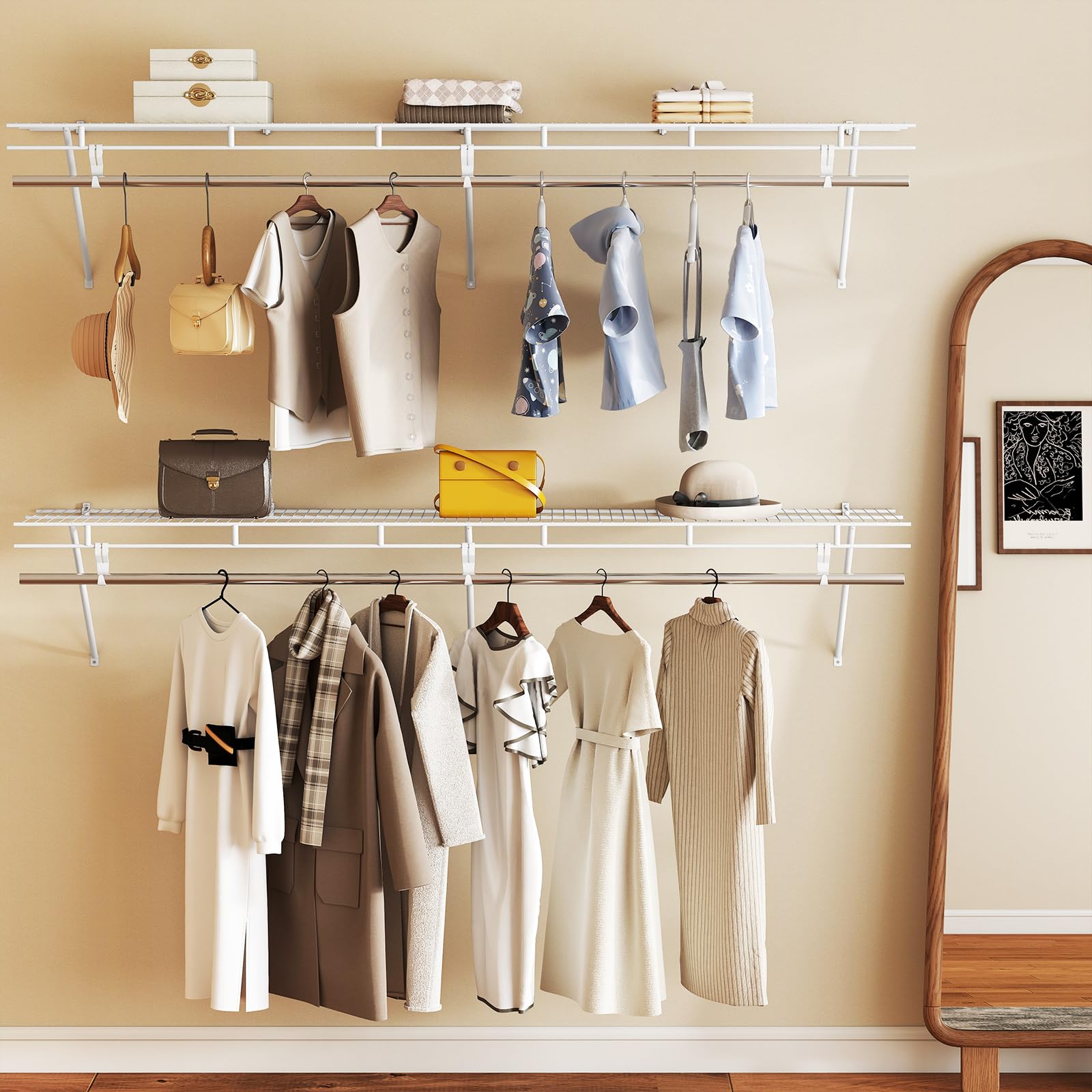 Efficiently organize your items with this versatile wall-mounted closet shelf featuring a 2-in-1 design that combines a spacious metal wire shelf and a sturdy hanging rod, perfect for organizing shirts, skirts, hats, bags and more. Crafted from heavy-duty metal, it offers reliable strength and resists deformation for long-lasting use. Easy to install with secure hooks and a stable triangular frame, it saves valuable floor space while providing dependable support. The open wire shelf ensures great ventilation, keeping your items fresh and making cleaning simple. Ideal for use in laundry rooms, bedrooms or closets, this compact shelving unit efficiently utilizes vertical space, providing a practical storage solution suited for various home environments.