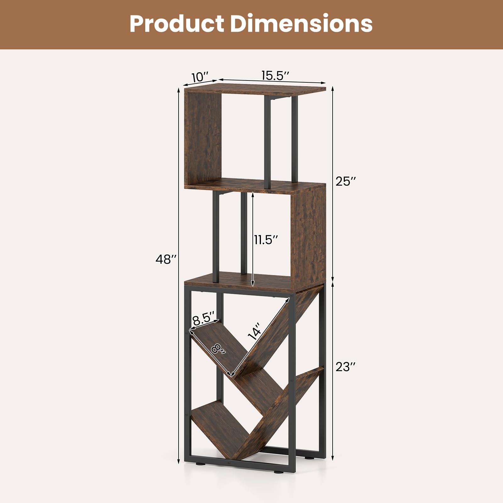 This bookshelf includes a 25" S-shaped geometric shelf and a 23" tree shelf, which can be used together for vertical storage or separately to fit different rooms or needs. It features a robust metal frame and anti-slip foot pads, ensuring reliable stability and long-lasting support. With 6 spacious tiers, the display shelf provides ample room while keeping items within easy reach. Safety is prioritized through the inclusion of 2 anti-toppling devices and smooth, splinter-free wooden boards that offer a safe and comfortable surface for daily use.