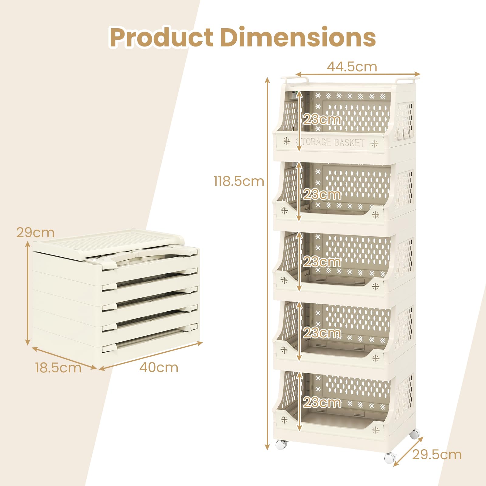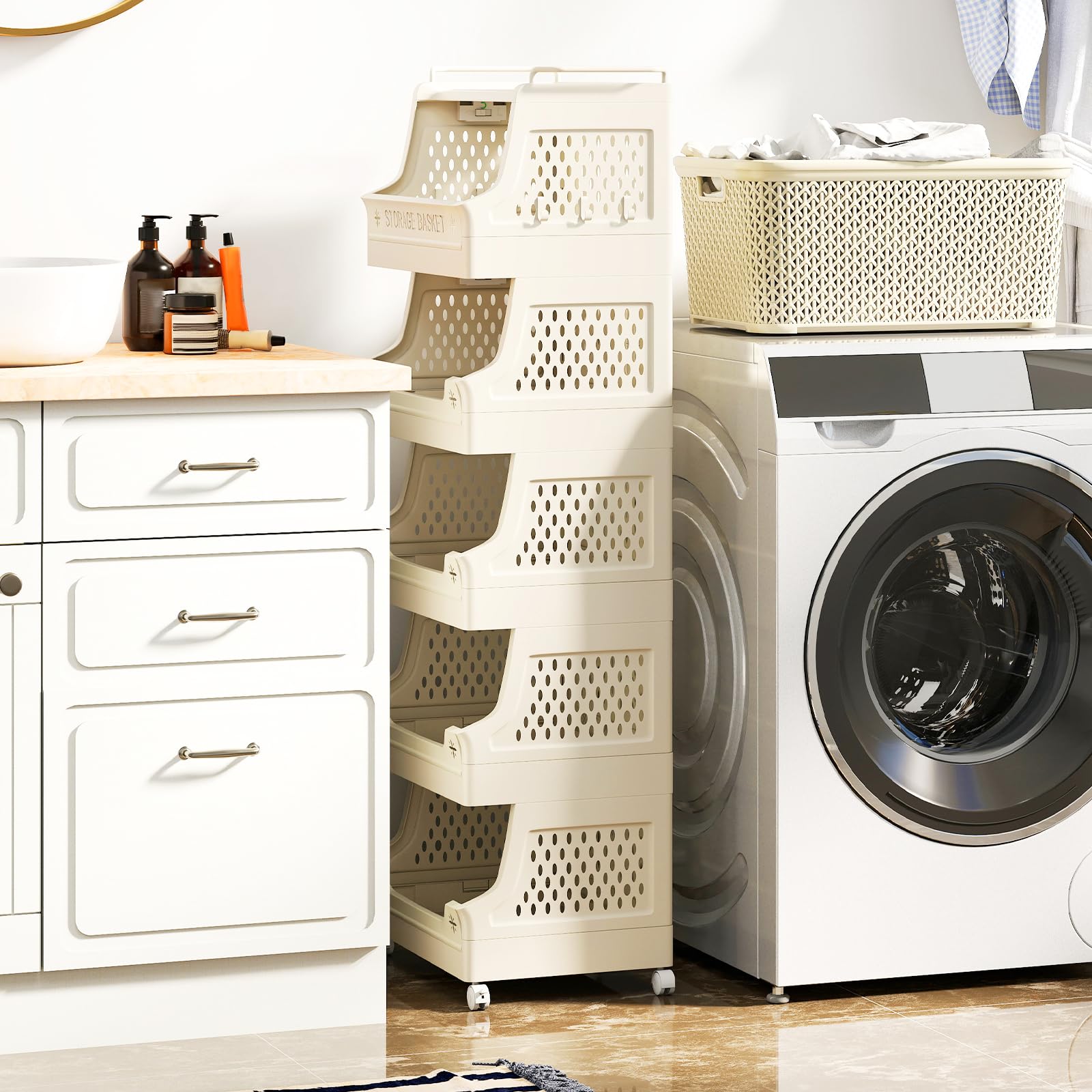 This versatile storage basket features 5 open shelves and a spacious top, complemented by 6 handy hooks for hanging items. Its breathable hollow patterns ensure proper ventilation, keeping your clothes fresh. Meanwhile, this laundry basket is equipped with 4 universal casters, 2 of which are lockable, and side handles for effortless maneuvering. Easy to assemble with a buckle design and a sliding button for fixation, it can also be quickly disassembled when not in use to save space. It can serve as a laundry basket, a bathroom organizer or a storage cart for various items. This is a multi-functional addition to your home, offering convenience and style.