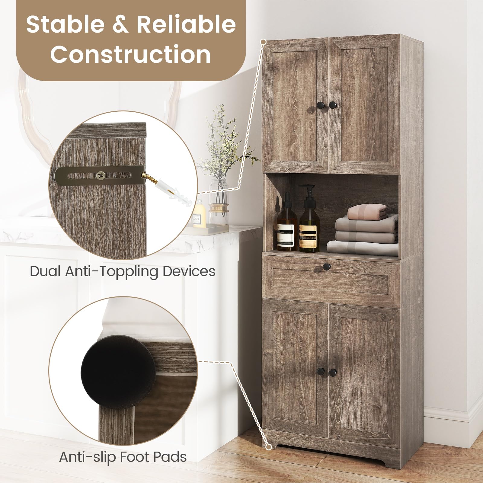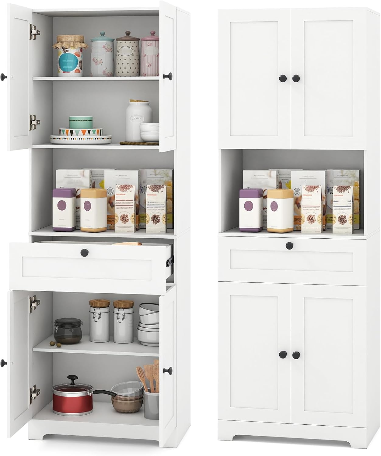 Featuring 4 doors, an open countertop and 1 drawer, this 67.5” tall floor cabinet offers ample storage solutions to keep your kitchen essentials neatly organized and easily accessible. The lower cabinet features a 3-position adjustable shelf to accommodate items of different sizes. Its modern and sleek design fits seamlessly in various spaces, including the kitchen, dining room, bathroom, living room and laundry area. What’s more, 2 anti-toppling devices are included to help secure the cabinet firmly against the wall, enhancing stability and safety.