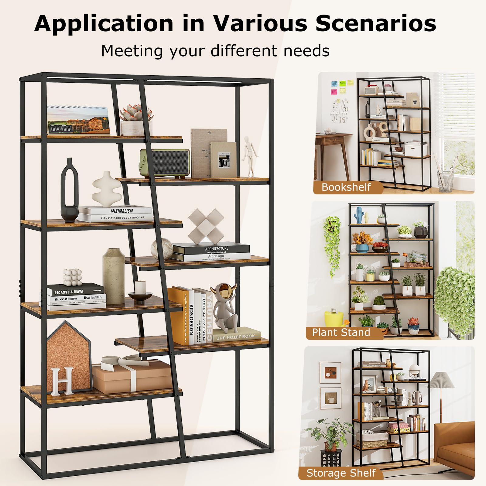 - [Generous 7-tier Storage Space]: Optimize vertical space with our stylish staggered shelves. The expansive 7-tier storage provides ample room for books, plants, photo frames, decor, and storage boxes, ensuring your items are neatly organized and beautifully displayed.