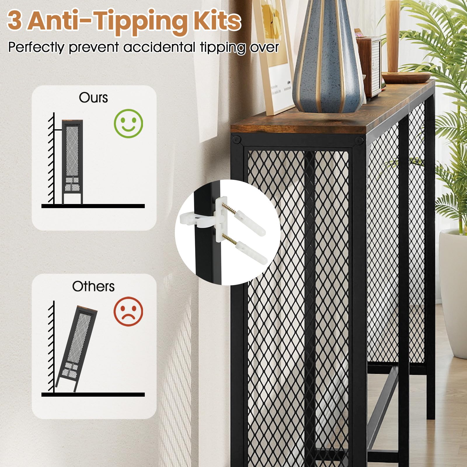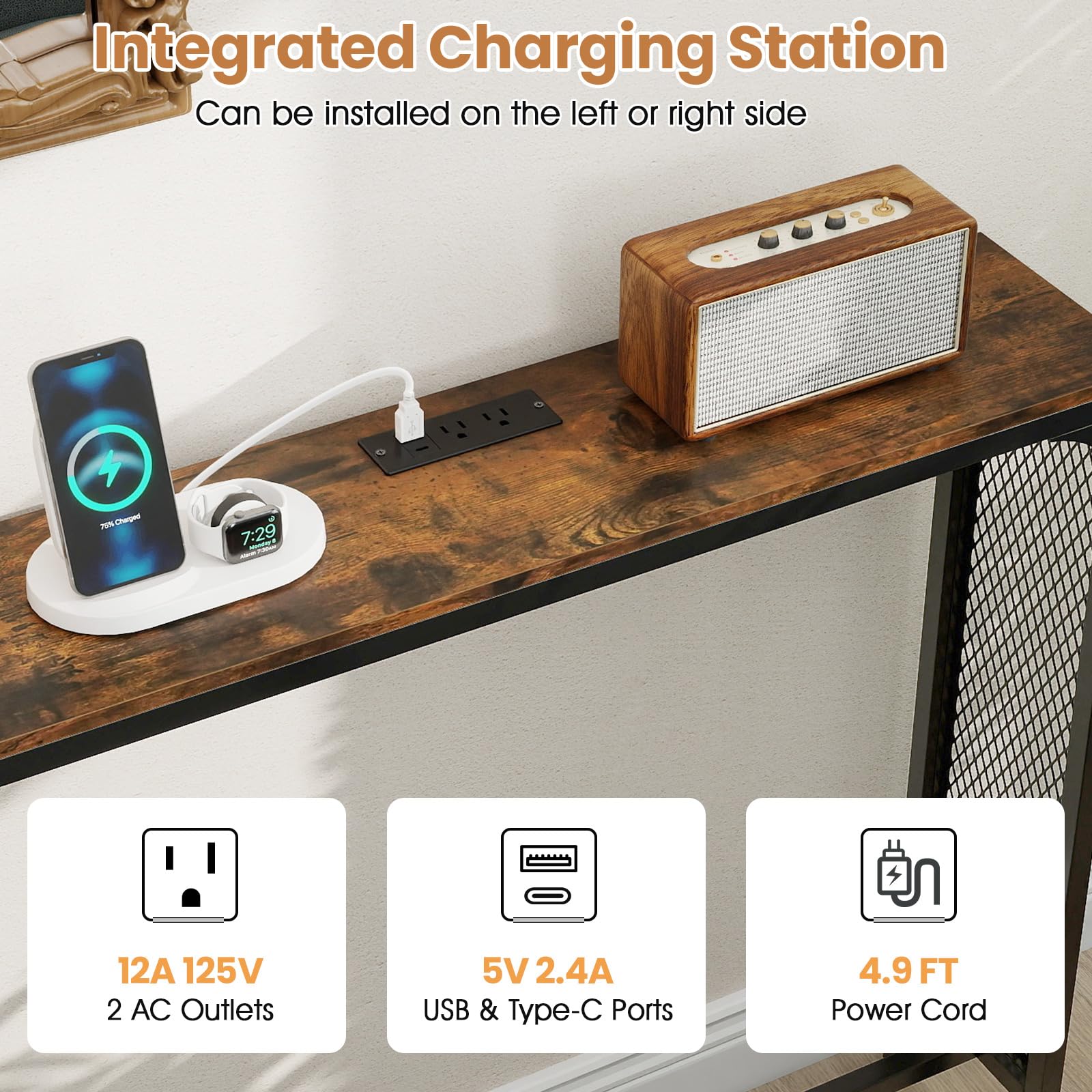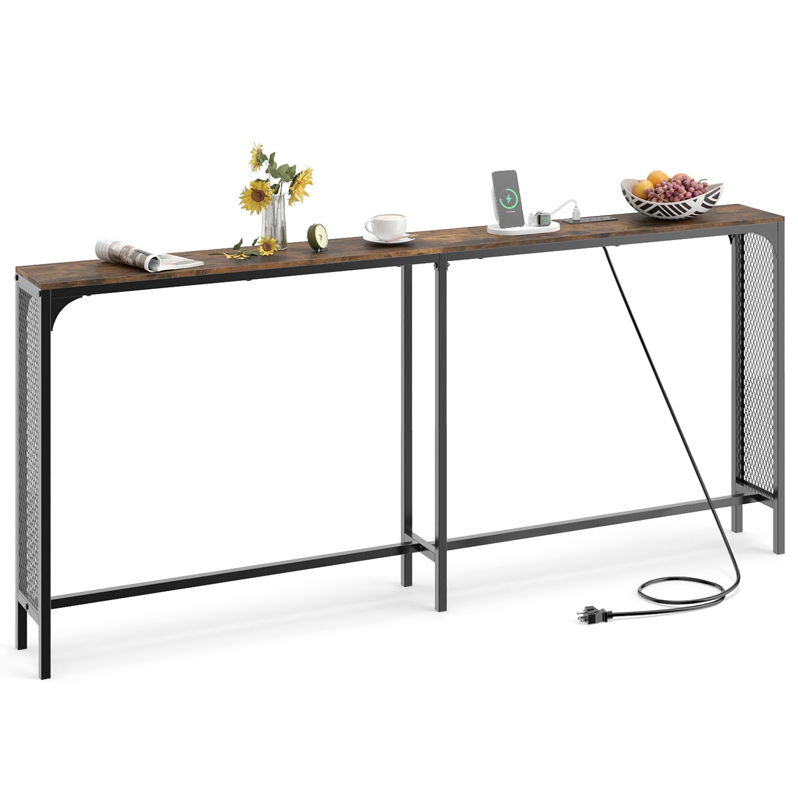 This extra long sofa table measures 71”L x 8”W, perfectly suited for tight spots like narrow hallways or behind couches. Designed with a reversible charging hub, it includes 2 AC outlets, a USB port, and a type-C port, making device power-ups quick and clutter-free. Built from sturdy metal tubing reinforced with crossbars and equipped with protective foot pads, it ensures lasting stability while safeguarding your floors. For enhanced safety, 3 anti-tipping kits keep the piece securely fastened. Its slim profile and versatile design make this hallway console ideal for organizing entryways or displaying decorations.