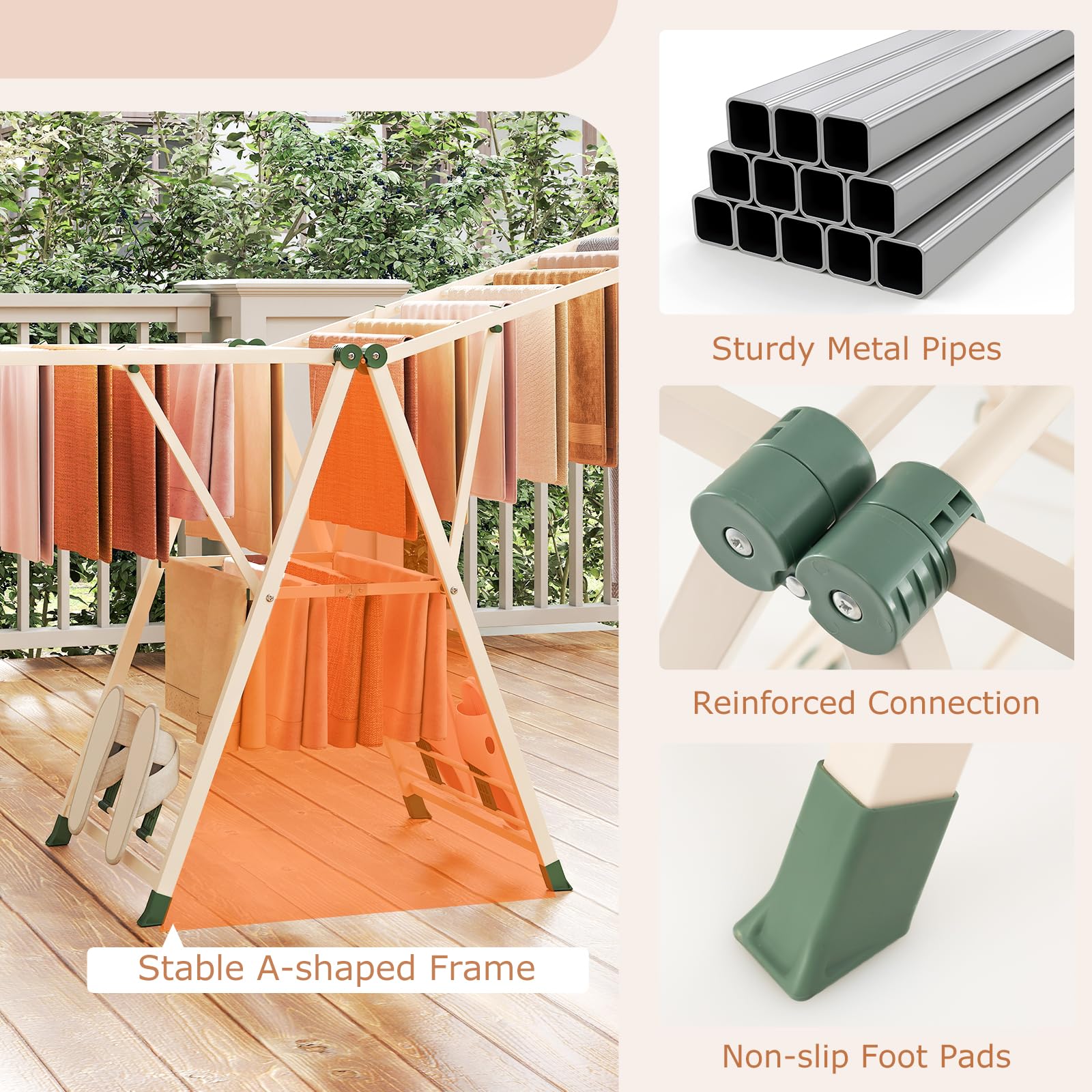 This clothes drying rack boasts spacious drying space, including drying rails, sock clips, and shoe racks, which can manage multiple loads of laundry at once. Moreover, the laundry hanger has height-adjustable wings to dry both small garments and large linens. The thoughtful spacing between the rails also promotes adequate air flow. Built with a strong metal structure and reinforced with A-shaped frame, the clothes drying rack combines stability with durability. Maximize your space with this foldable drying rack that tucks away easily when not in use.