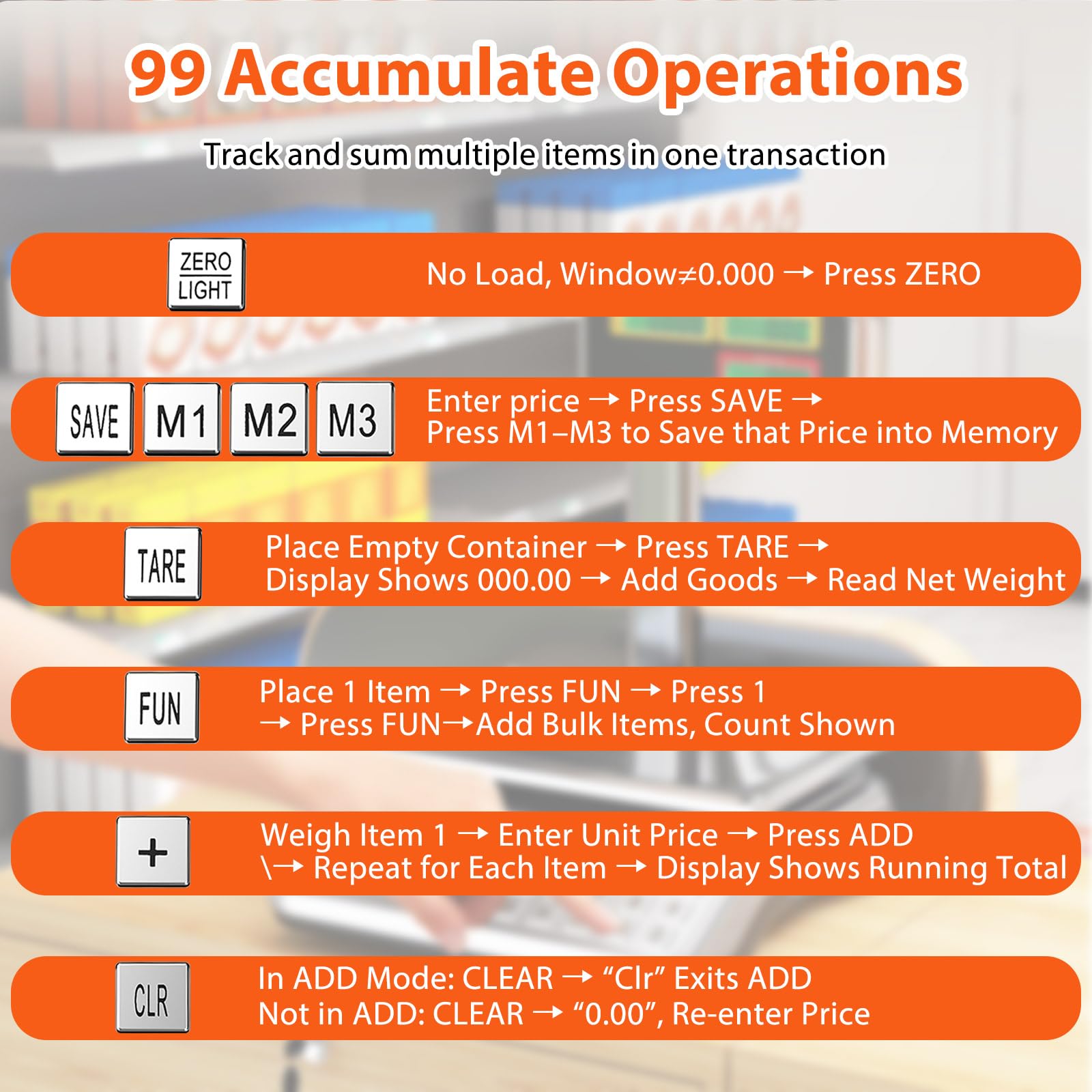 Supports tare, counting, clear, and accumulate for efficient operation.