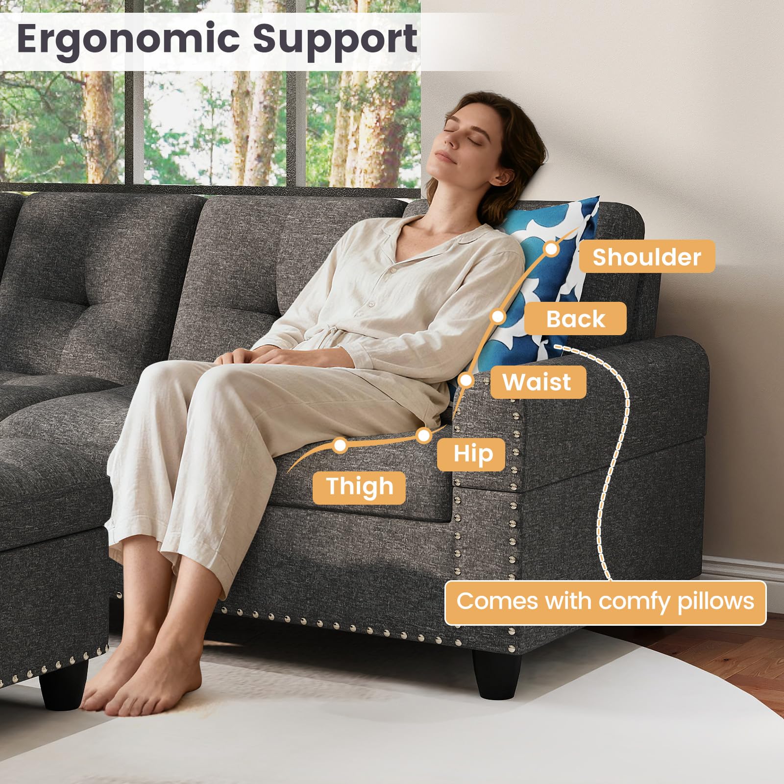 Enjoy ultimate comfort in your living room with our L-shaped sofa with an ottoman! With 1 chaise lounge, 1 loveseat, and 1 ottoman, you can customize your resting space as your like. The storage ottoman can also tuck away blankets, remote controls, or magazines, keeping a tidy and inviting area. You can also place your legs on the ottoman to relax. One of the backs can be converted into a tray with 2 cup holders to place your beverages. The backs and seats feature high-quality linen fabric cover and soft sponge filling. Additionally, 2 pp cotton filled pillows provide you with added comfort. The L-shaped sofa couch is an ideal choice for living rooms, offices, small apartments, and more. Whether entertaining friends or enjoying a quiet evening, this sectional sofa is your go-to option.