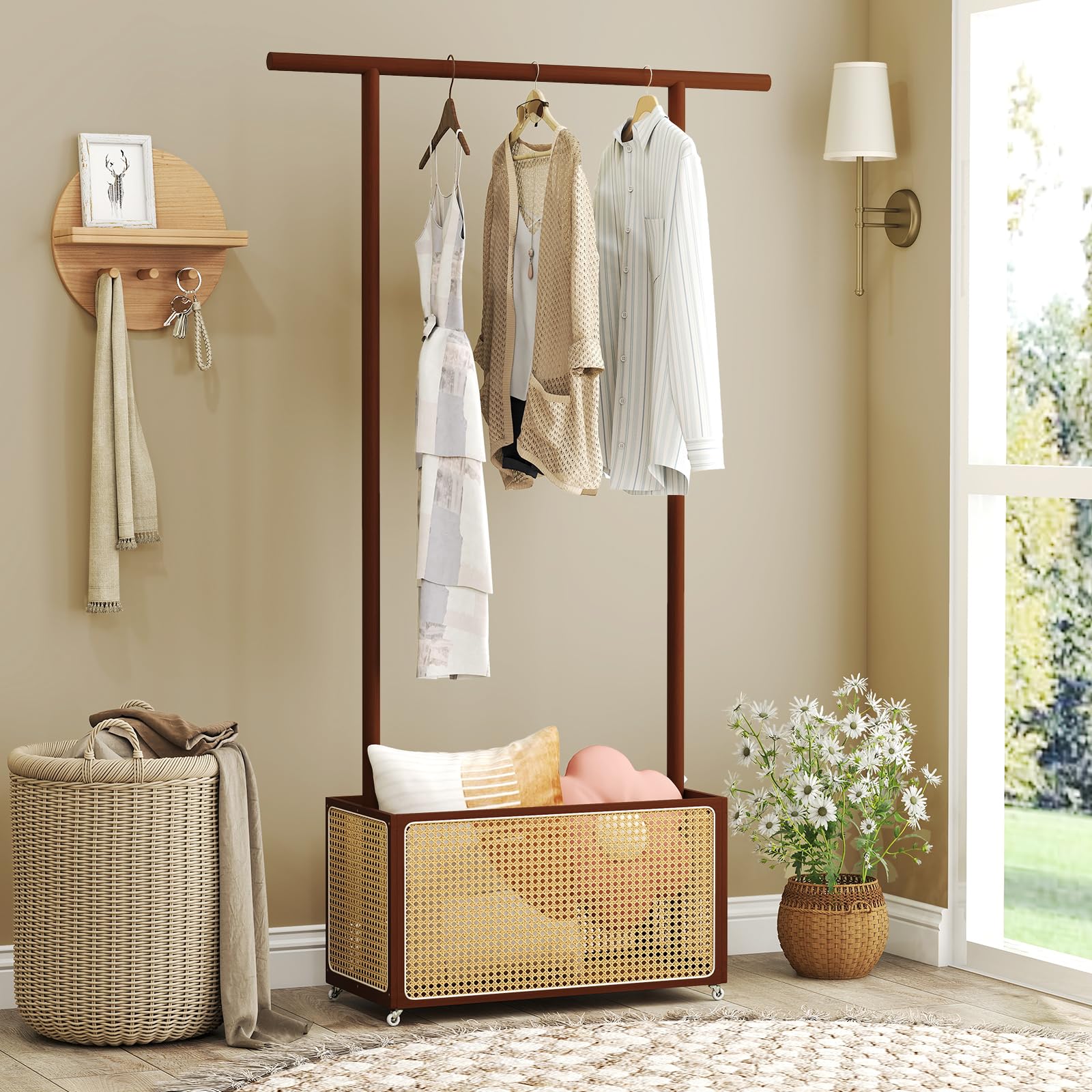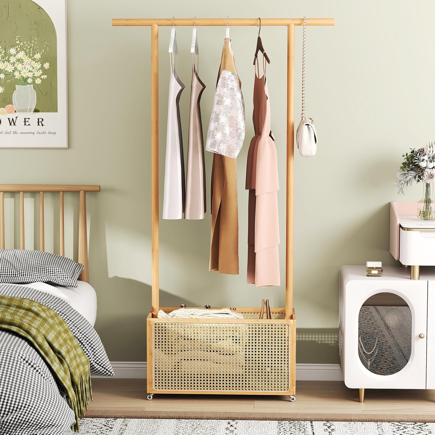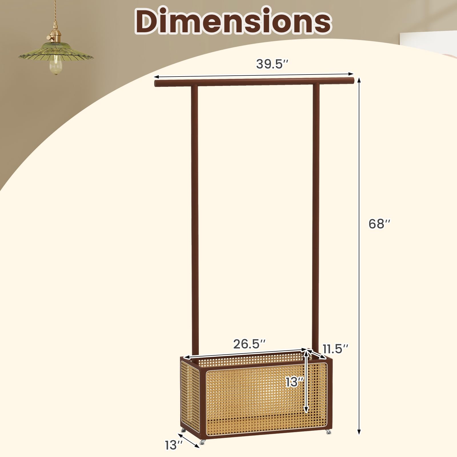 This stylish clothes rack features a hanging rod and a storage basket, perfect for organizing a wide range of items including clothing and bedding. Crafted from natural material, the bamboo clothing rack is both easy to maintain and reliable. It features 4 universal wheels for effortless mobility and 2 lockable wheels for stability. The rack's PE rattan surface adds a touch of rustic elegance and is resistant to fading, tearing, and weird smells. With dimensions of 39.5" x 13" x 68" (L x W x H), this versatile organizer fits well in hallways, living rooms, bedrooms, and more, offering both style and functionality to your home decorations.
