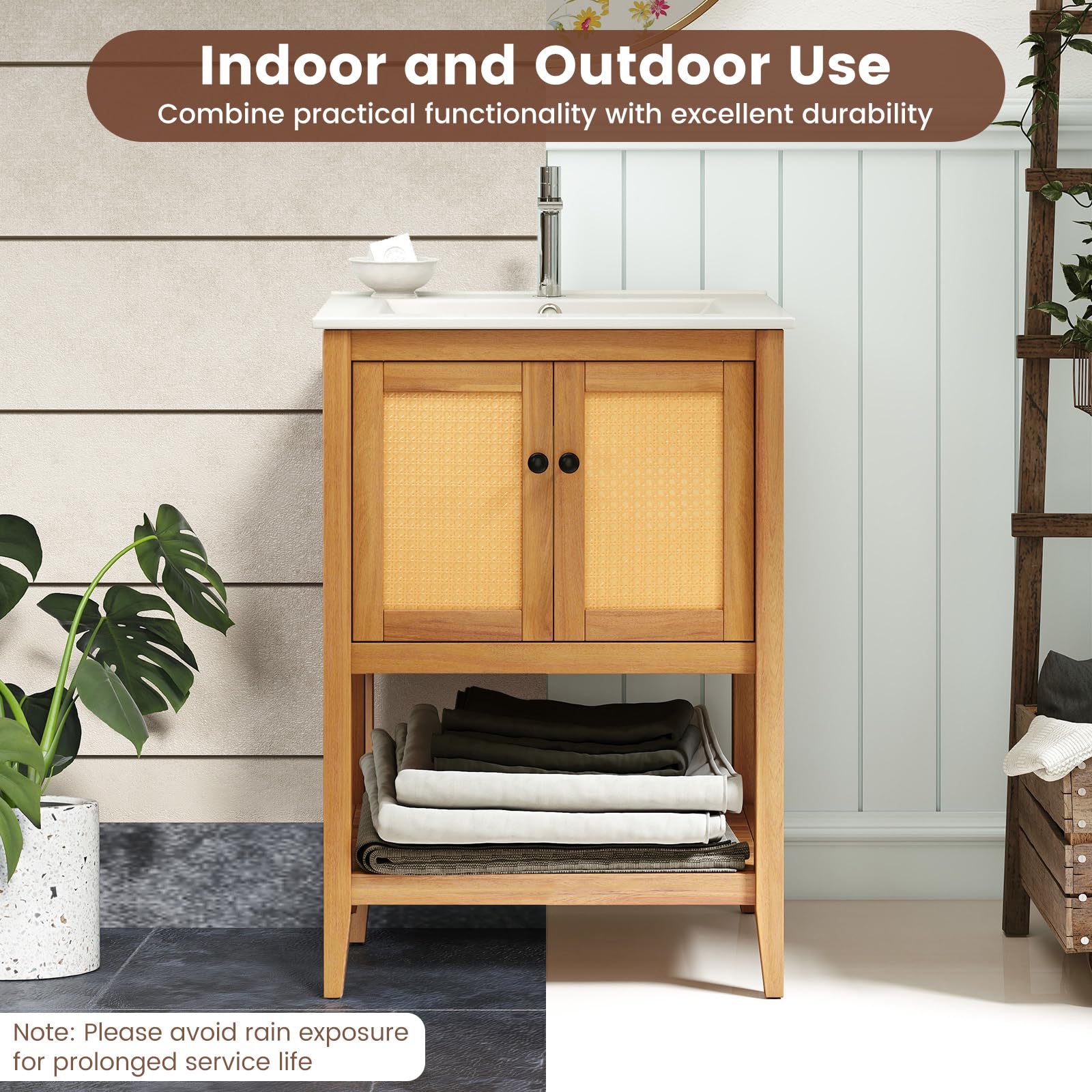 Crafted from solid acacia wood, this bathroom storage cabinet offers long-lasting steadiness, enhanced by a reinforced crossbar for added stability. Plus, the 2-door storage cabinet, made from high-quality PE rattan, not only enhances ventilation but also infuses a warm atmosphere into your space. Moreover, this storage vanity is not just sturdy but also provides ample storage, featuring a slatted open shelf for towels and frequently used items, while the ceramic sink includes a pre-drilled faucet hole and an overflow to prevent water spillage.