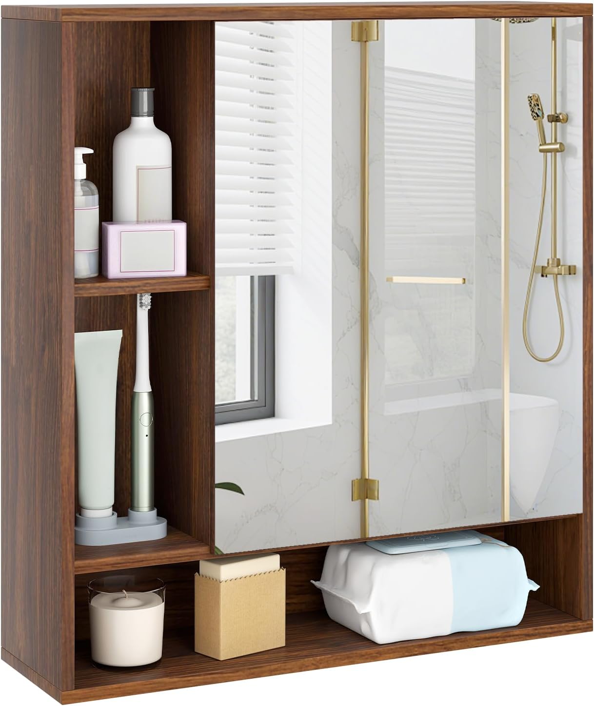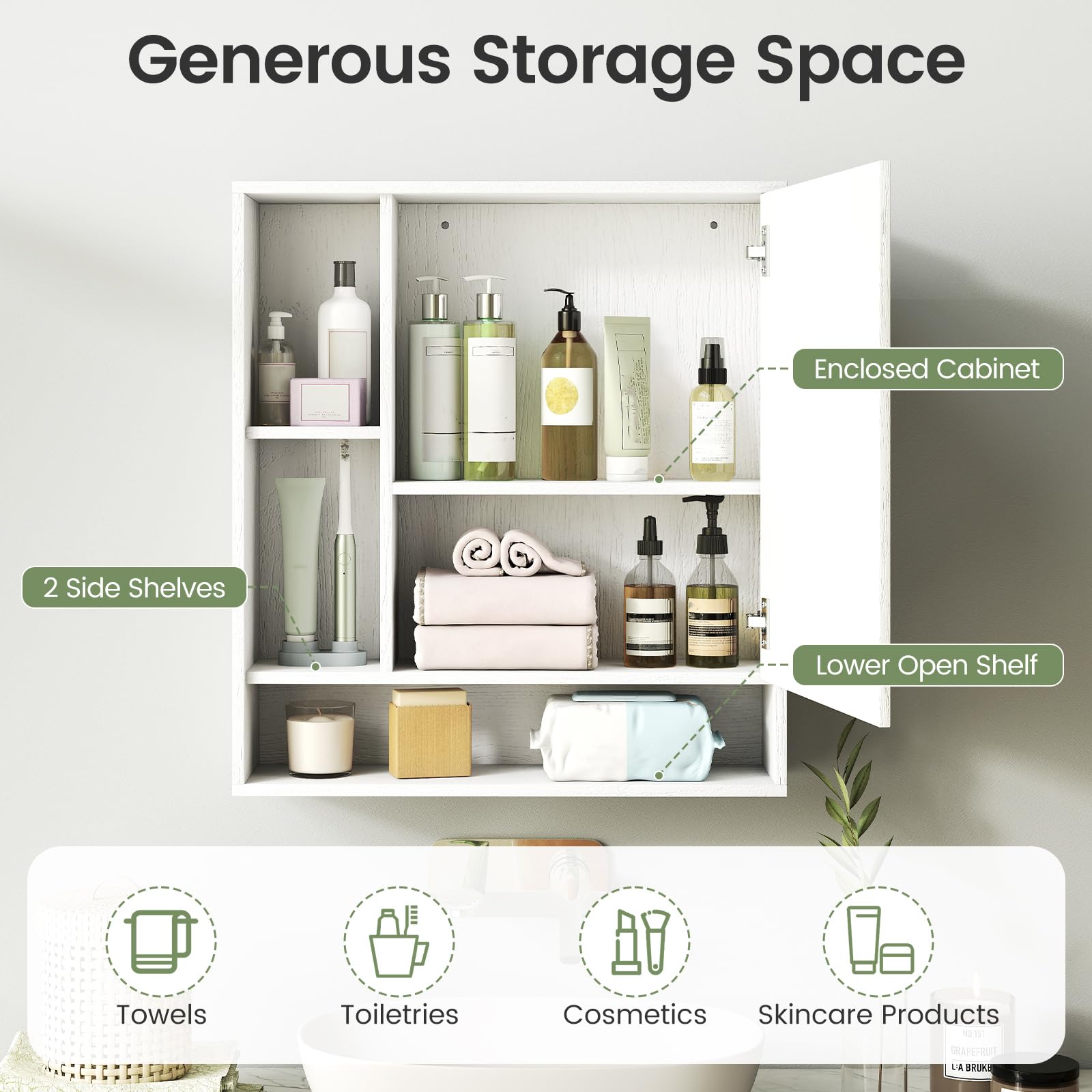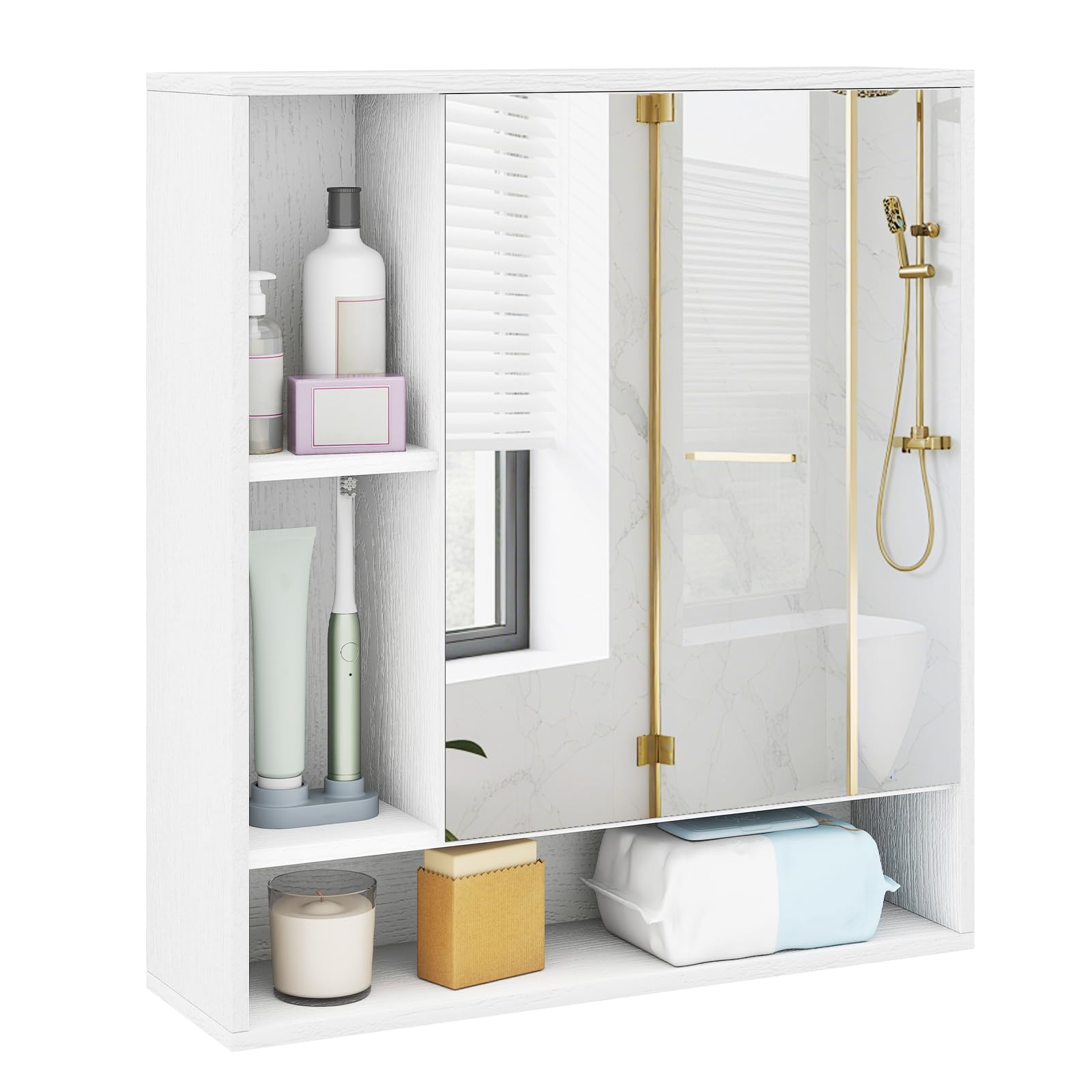 This medicine cabinet offers a single door concealing an adjustable shelf with 3 height options, ideal for customizing the space to suit your needs. Additionally, 3 open shelves provide easy access to frequently used items, helping to keep your essentials neatly arranged. Crafted to optimize storage without occupying floor space, this wall mounted storage cabinet helps reduce clutter and maintain a tidy environment. Its clean lines and wood grain finishes blend seamlessly with various interior styles, contributing both utility and visual appeal to your home.