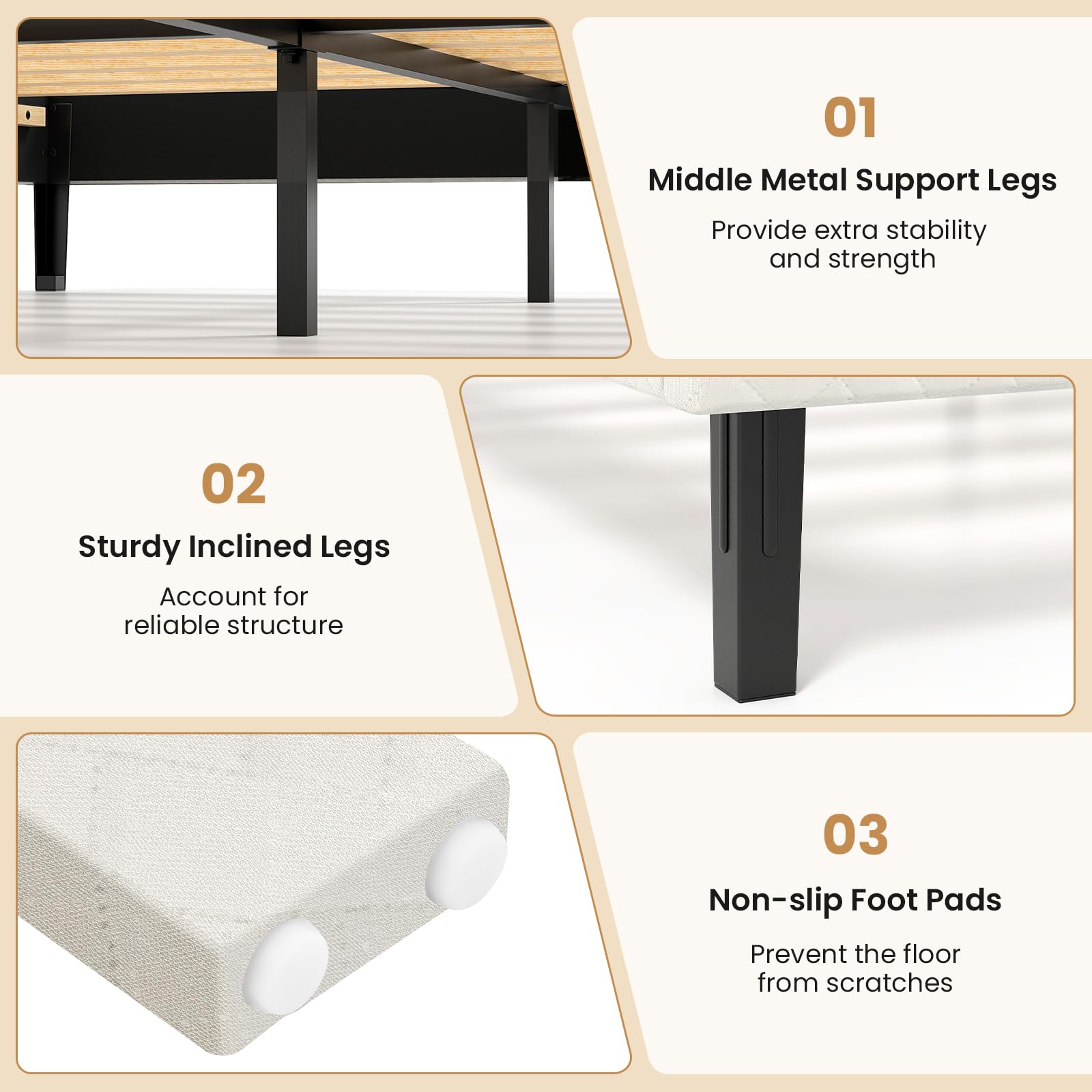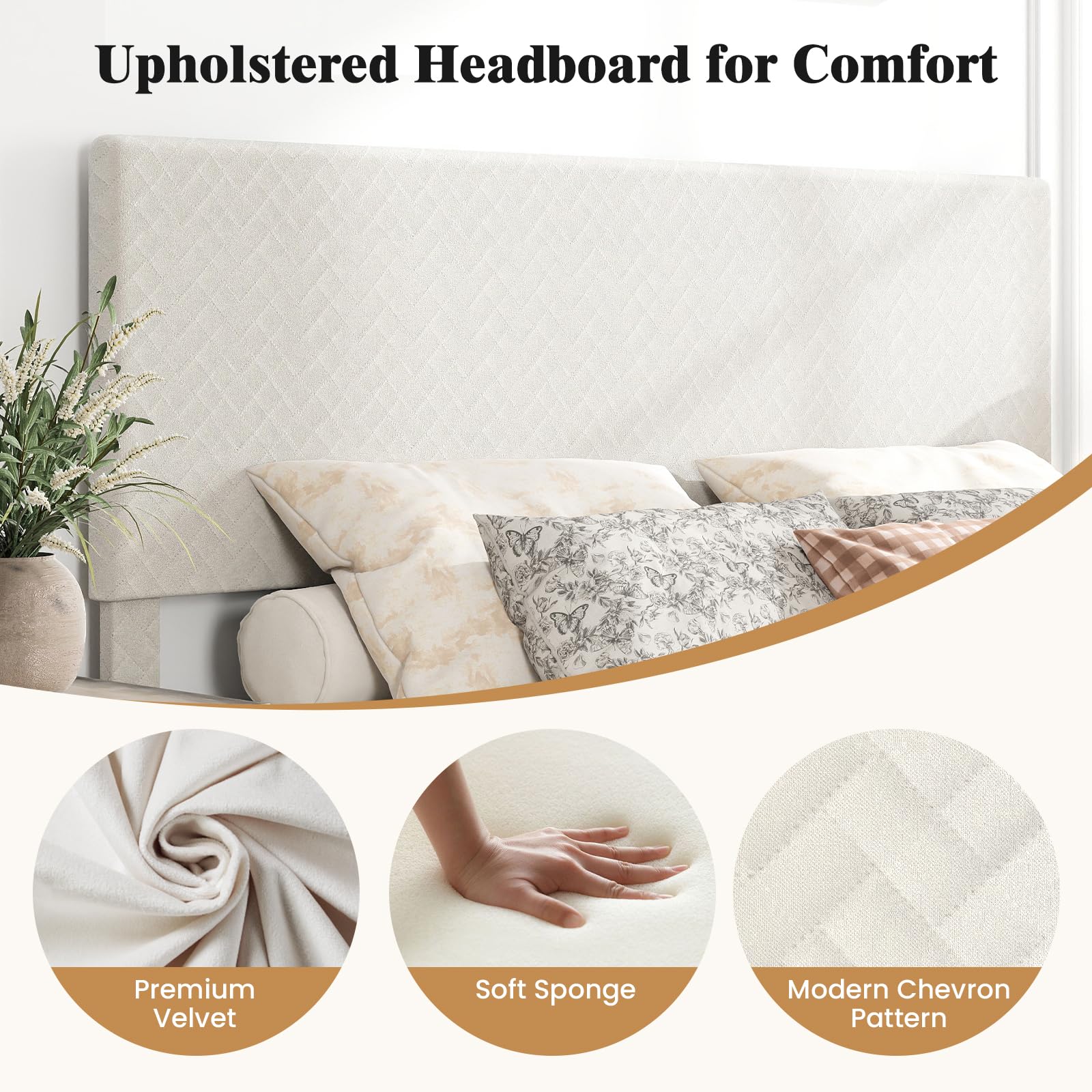 The headboard offers 3 adjustable height settings that cater to different mattress thicknesses. Upholstered in soft velvet and filled with high-density sponge, the platform bed boasts optimal comfort and relaxation. The sophisticated chevron design brings a modern and stylish touch to your bedroom. Built with enduring wooden slats and reinforced with central metal legs, the bed frame provides a solid foundation for your mattress. Plus, with 6.5 inches of under-bed clearance, you can easily maximize bedroom space. All in all, this bed combines comfort, style, and functionality perfectly.