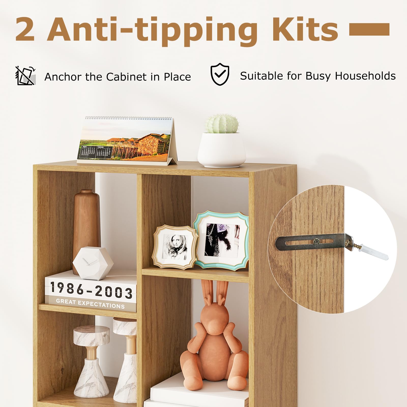 2 anti-tipping kits anchor the cabinet in place, suitable for busy households
