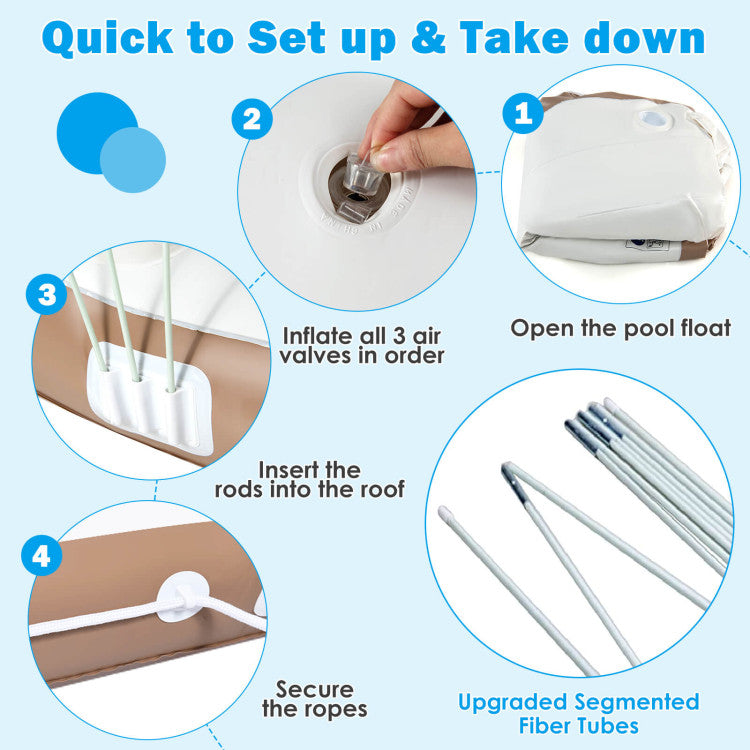 - Retractable Canopy for Sun Protection: This floating island is equipped with a large sun shade which can be adjusted to different angles according to your different needs. So you don't have to endure the strong sunlight when enjoy the sunny days on the float lounge. The canopy can be quickly removed when you want to take a sunbath or at home.