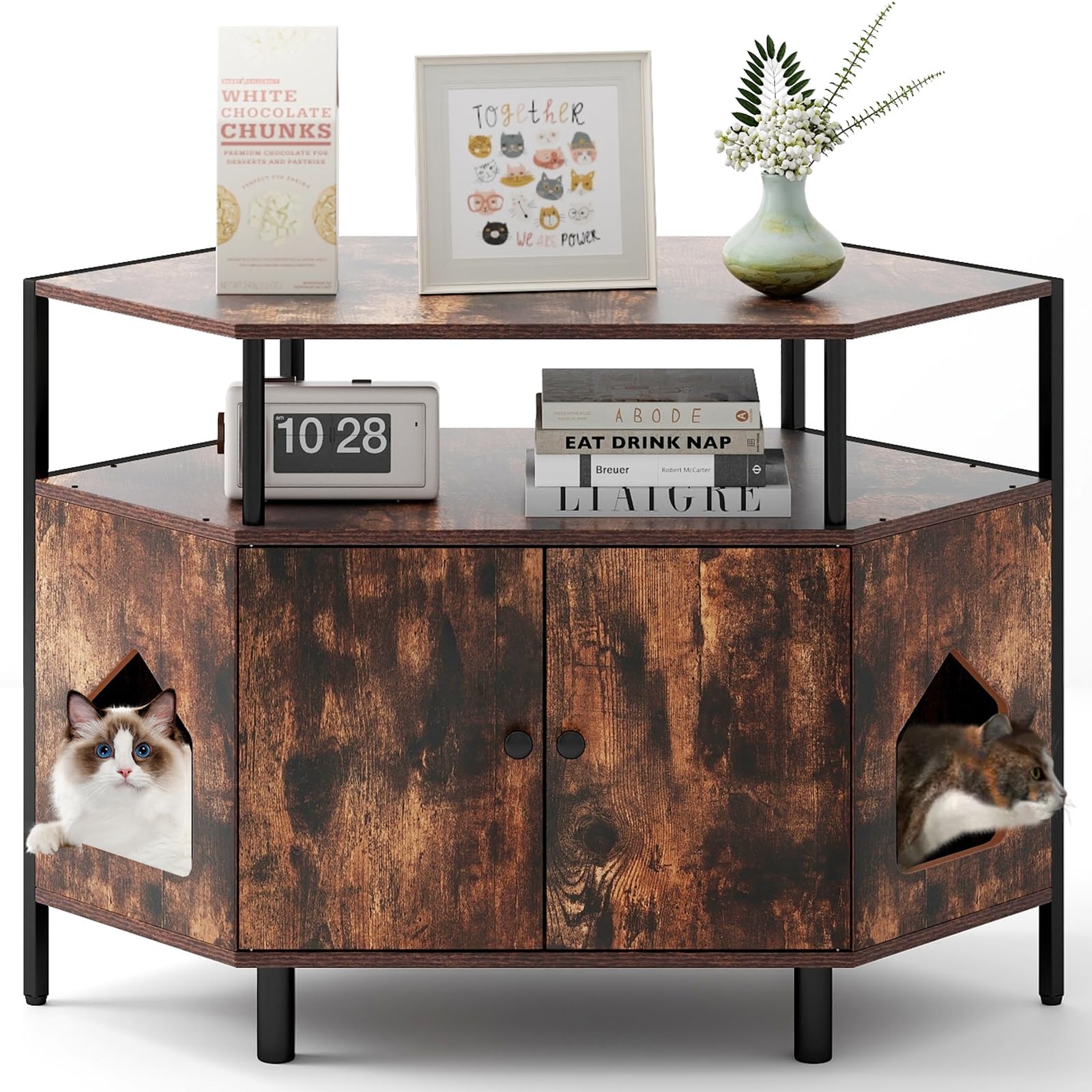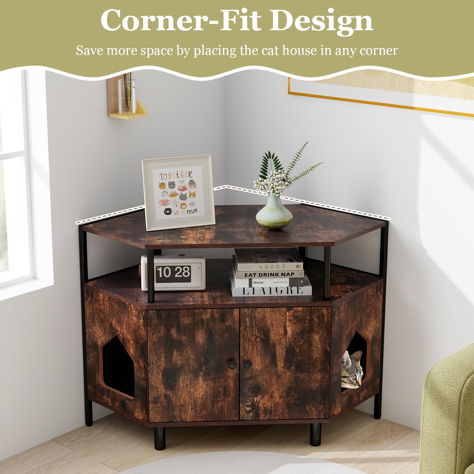 Features: Save space with corner placement Wide cabinet top and open shelf for storage Enclosed living space for cat privacy Dual entrances for easy access Magnetic catches for secure closure Selected anti-crack, burr-free boards Robust metal frame for stability Thickened support legs for stability Ideal for living room, bedroom, or entryway