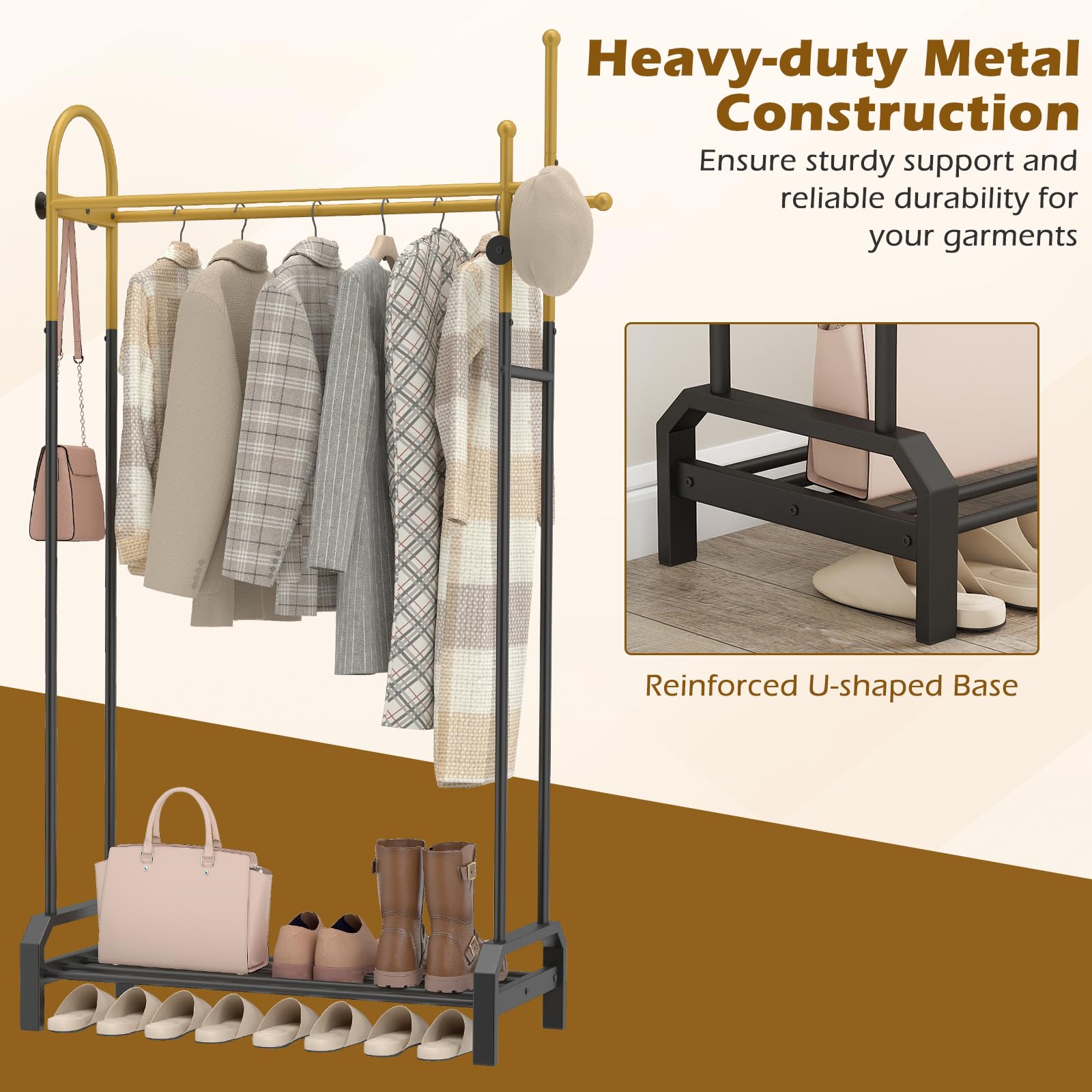 This freestanding clothing rack features robust metal pipes that ensure durability and a heavy-duty structure capable of supporting heavy garments. Equipped with 5 coat hooks, a side hanging bar, and a bottom shelf, the metal clothes organizer offers comprehensive storage for accessories, while the 2 rods are perfect for hanging clothes. The anti-falling beads prevent items from slipping off, while rounded corners protect garments from being scratched. Boasting a stylish design, this heavy-duty garment rack is ideal for bedrooms, laundry and living rooms, providing a practical and aesthetically pleasing organizational solution.