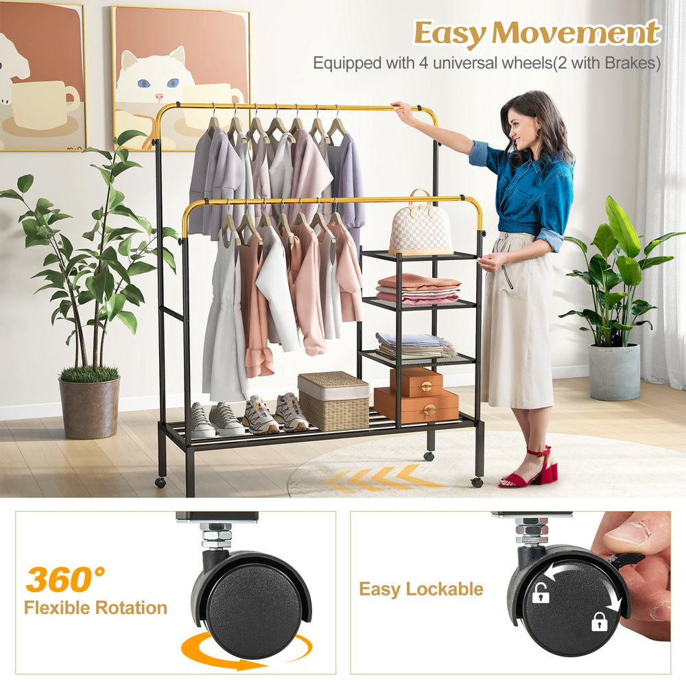Looking for a clothes drying rack with ample storage space, easy mobility, and adjustable hanging height? Our double rods clothes drying rack has it all. With 2 hanging rods, a side hanging area, and a bottom storage rack, you can easily store clothes, pants, shoes, and boxes. Equipped with 4 wheels, including 2 with brakes, it allows for effortless movement. Besides, Our clothes rack offers two rod heights and easy-to-use adjustable knobs, allowing you to fit clothes of different lengths. Crafted with high-quality carbon steel for durability and rust-proofing, this 2-position hanging rods can provide long time service. Experience convenience and practicality with our exquisite double rods clothes drying rack!