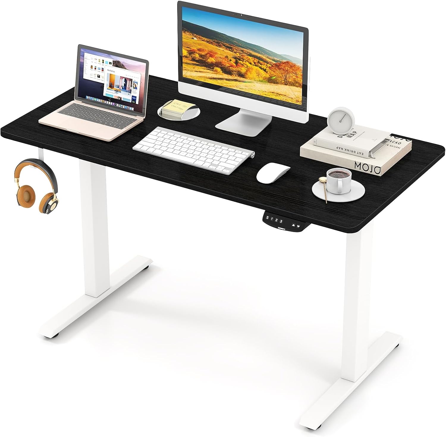 This electric standing desk offers a versatile workspace with an adjustable height range from 27.6" to 47.3", enabling smooth transitions between sitting and standing for improved comfort. The spacious tabletop provides ample space for monitors and essential accessories, while the headphone hook and cable management holes help keep your workspace tidy. Equipped with 3 memory height settings, the stand up allows for quick switching between your preferred positions at the touch of a button. Designed for safety and durability, the ergonomic sit stand desk features an anti-collision system for secure operation. Together with heavy-duty metal frame, higher stability is ensured.