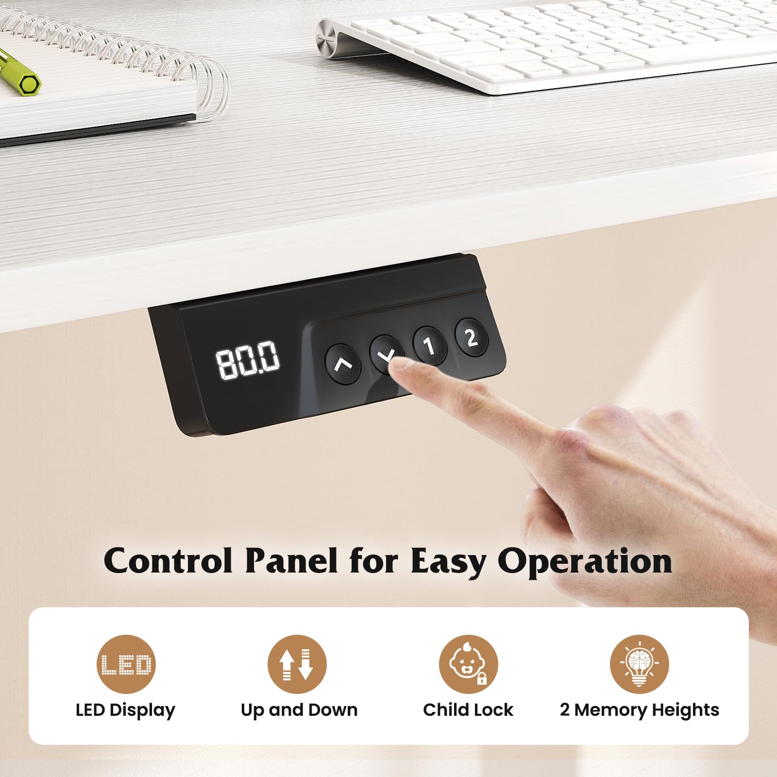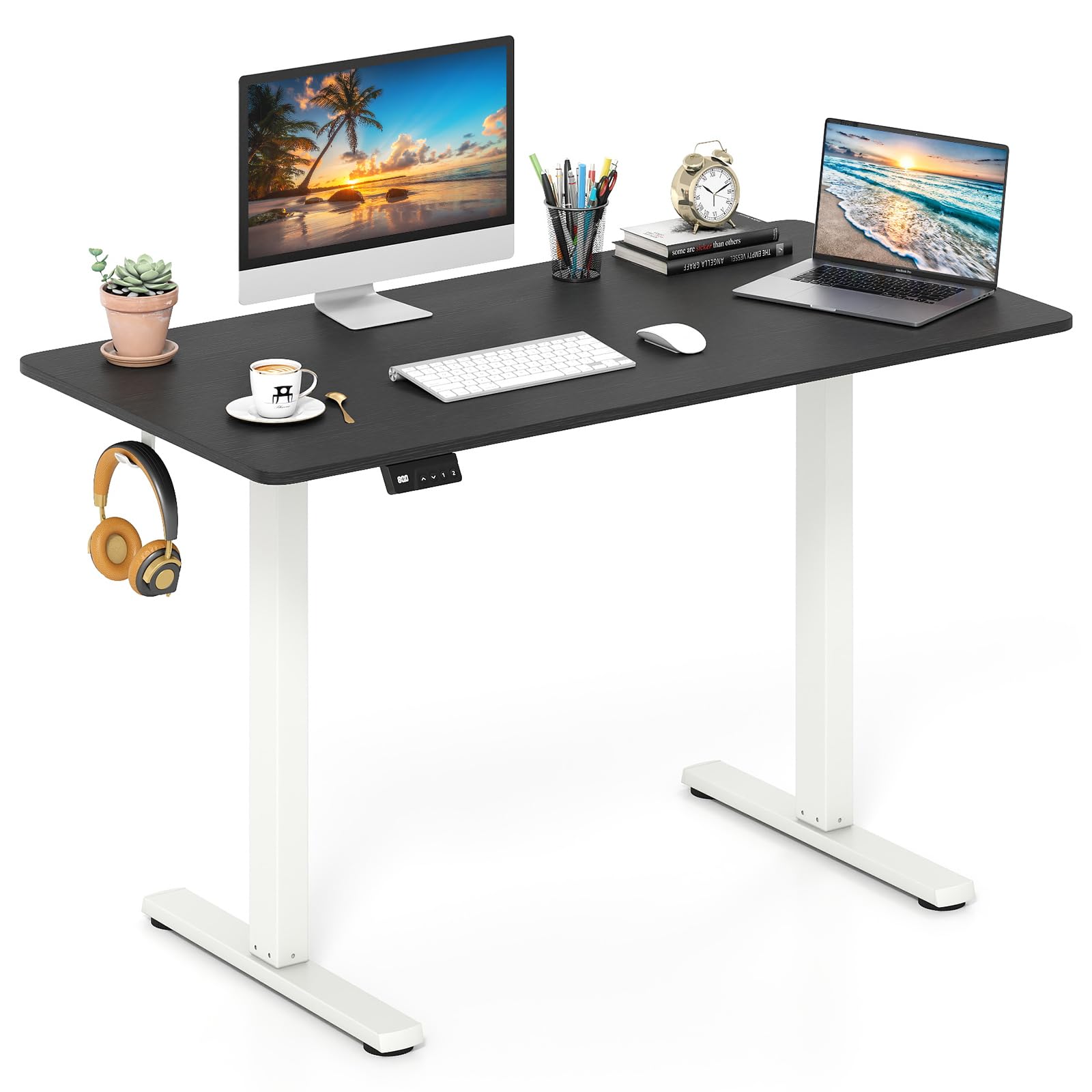 This electric standing desk provides a flexible workspace with an adjustable height range from 28.5" to 46.5", allowing seamless transitions between sitting and standing for enhanced comfort. Its spacious tabletop offers plenty of room for monitors and essential work items while the headphone hook helps maintain an organized area. With 2 programmable memory height settings, you can quickly switch between preferred positions at the touch of a button. Built with safety and durability in mind, the sit stand desk features an anti-collision system that ensures secure operation. Supported by heavy-duty metal frame, the height adjustable desk presents reliable stability and long-lasting performance.