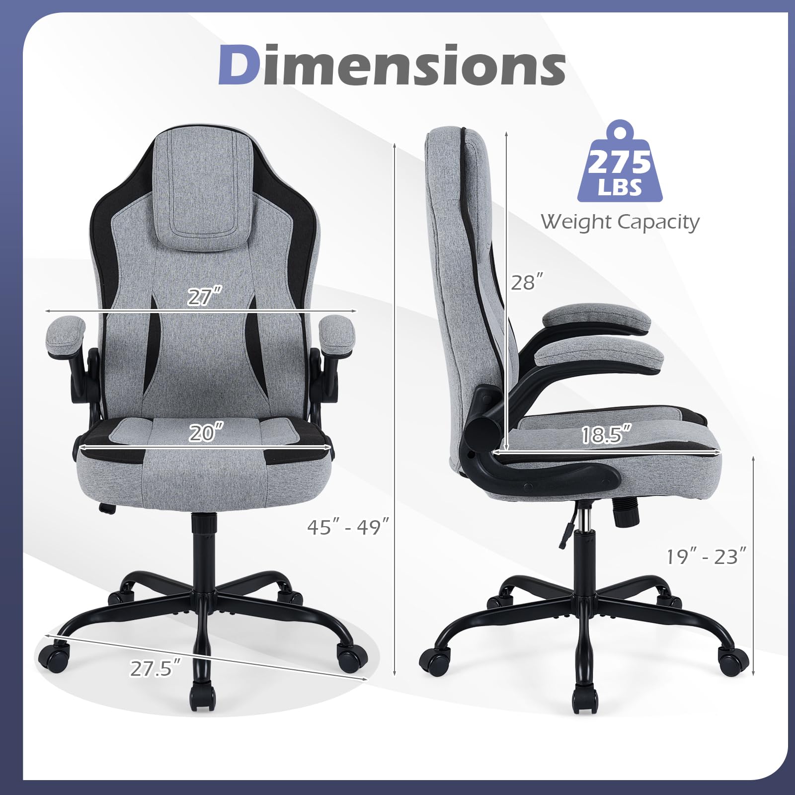 Upgrade your workspace with this chic, ergonomically designed office chair! Wrapped in breathable, dual-tone linen and cushioned with plush, high-density foam, it keeps you comfy all day. The high back with integrated headrest cradles your spine for support, while the waterfall seat eases hip strain during long hours at your desk. Flip-up, soft-padded armrests let you slide the chair seamlessly under any workstation, saving valuable room. Effortlessly glide, swivel, or adjust the height to your perfect fit, all controlled via a convenient height adjustable and rocking lock lever. Plus, enjoy soothing rocking between tasks. Crafted with a heavy-duty metal base and smooth-rolling wheels, this executive chair delivers lasting stability and safety. Elevate your office style and comfort with this adjustable desk chair!